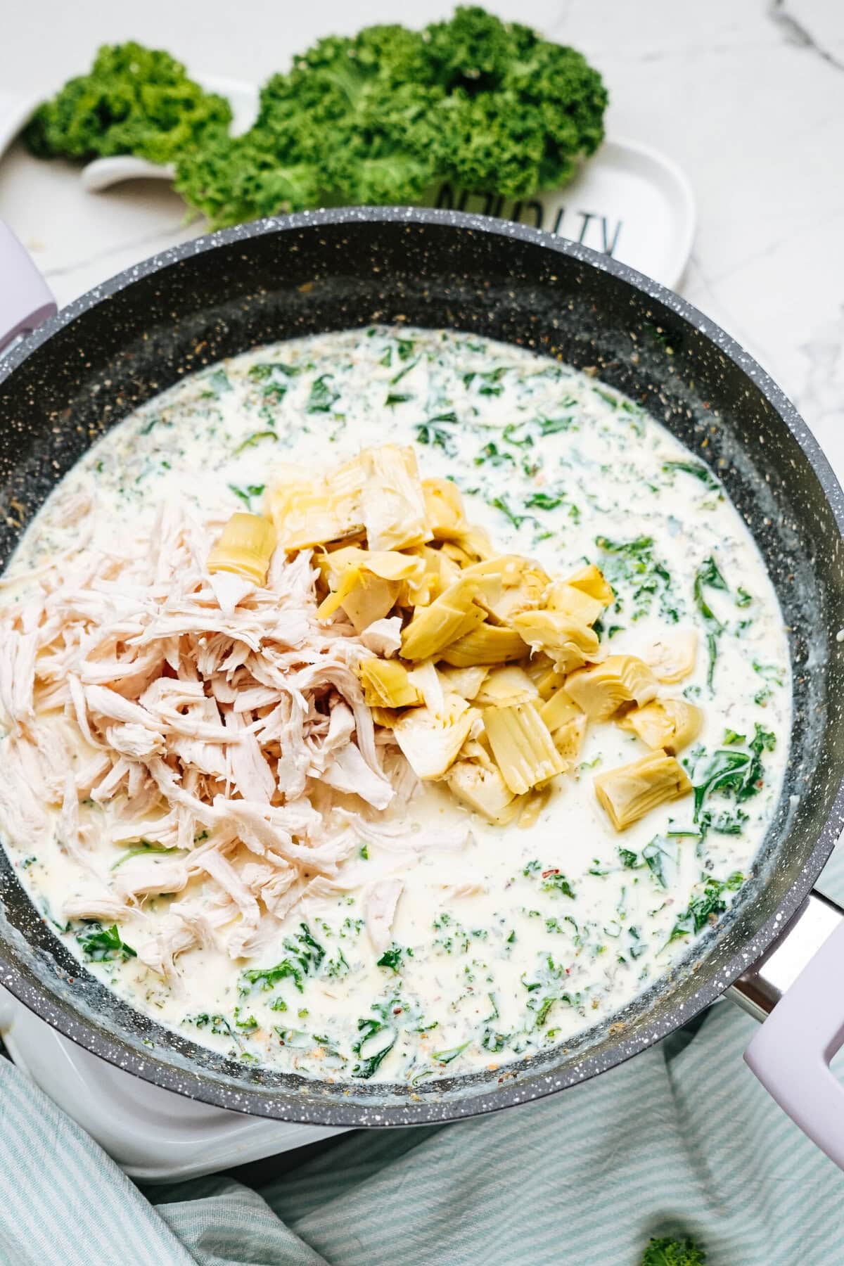 - Add in cooked, shredded chicken, artichoke hearts and parmesan cheese. Stir to combine.