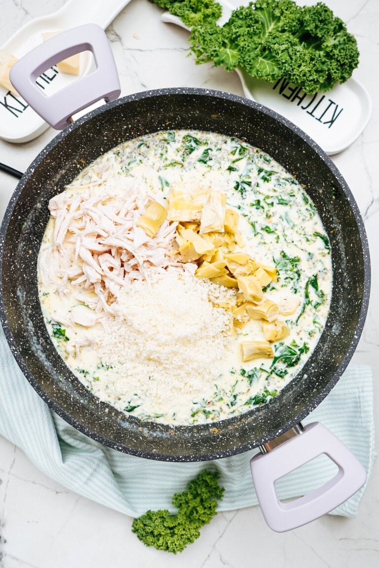 Stir in cooked chicken, artichoke hearts, and parmesan cheese. Heat until chicken is warmed through and the sauce begins to thicken.