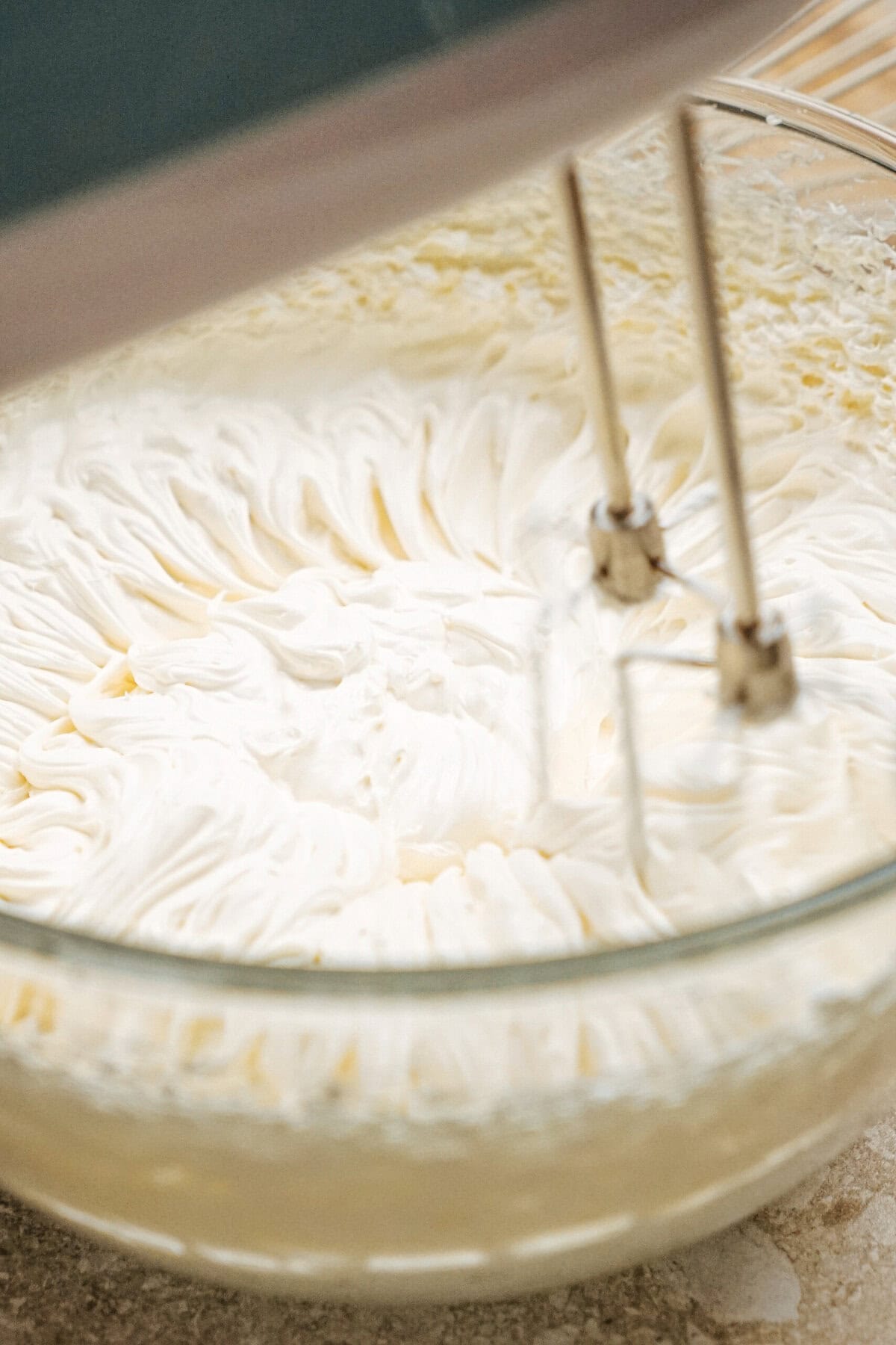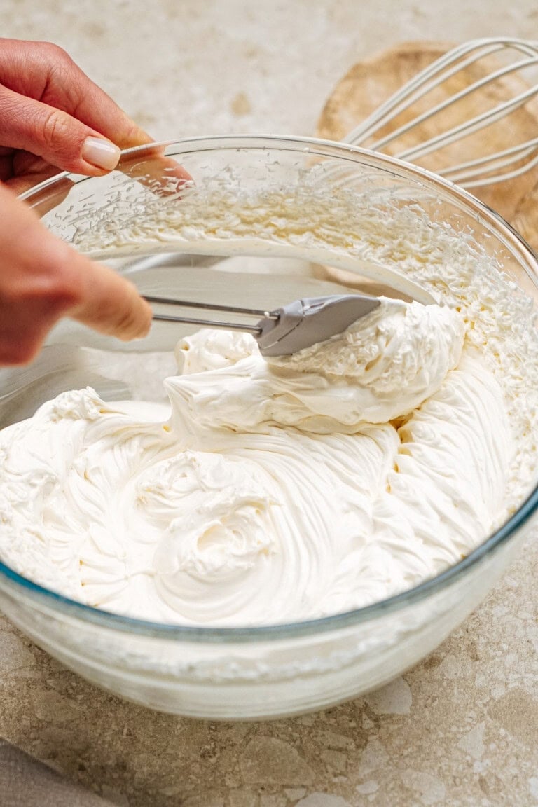 With the mixer on, add heavy cream in four increments, letting it whip into the cream cheese after each addition. Whip on medium speed for 1 minute until thick and light (stiff peaks). Scrape the sides and bottom to ensure even mixing and whip again if needed.