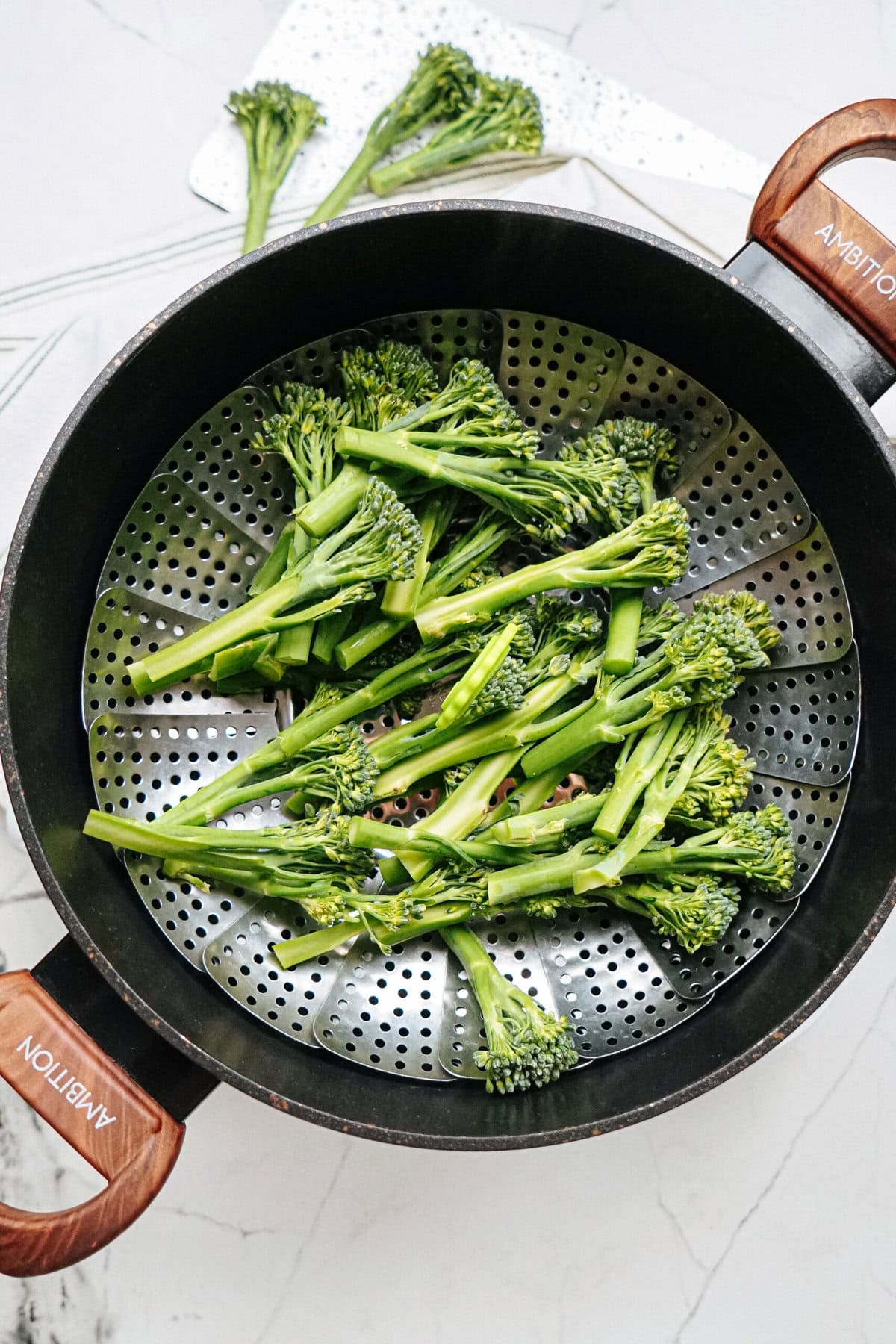 - Bring a large pot of water to a boil. Salt generously, then add broccoli rabe to a steam basket, reduce heat to a simmer, place a lid on the pot, and steam for 4-5 minutes or until tender.