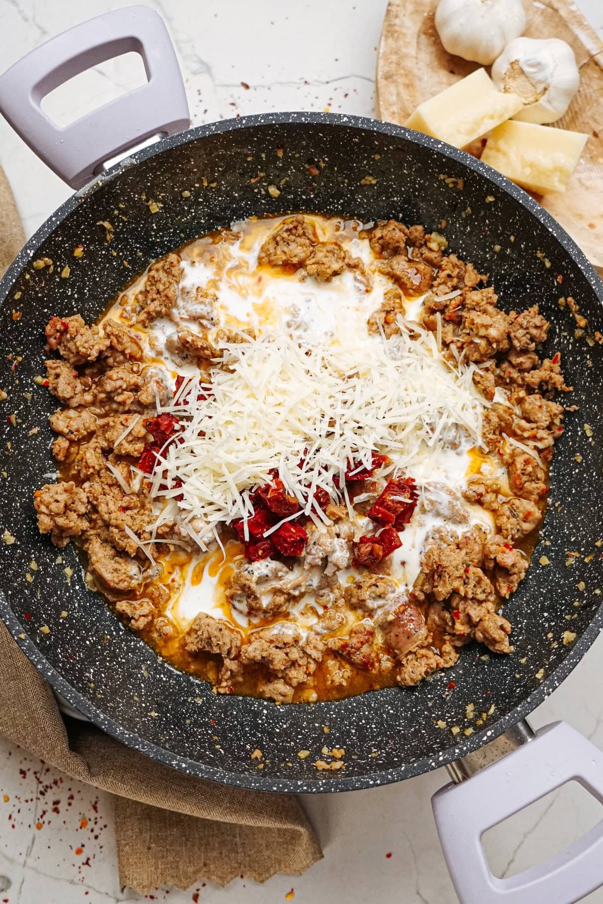 - Reduce heat to low. Stir in sun dried tomatoes, heavy cream, and 1/4 cup of the pecorino romano cheese.