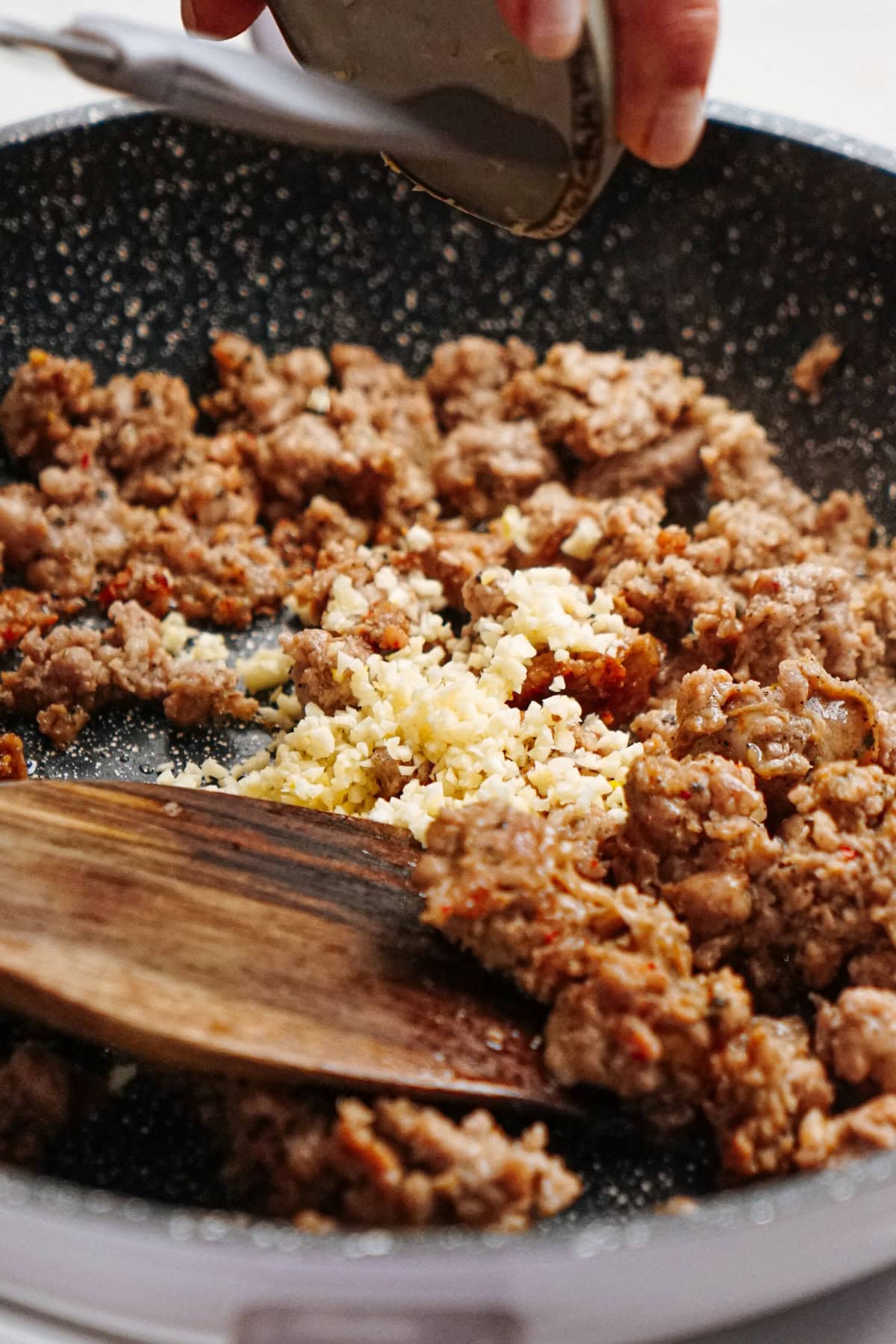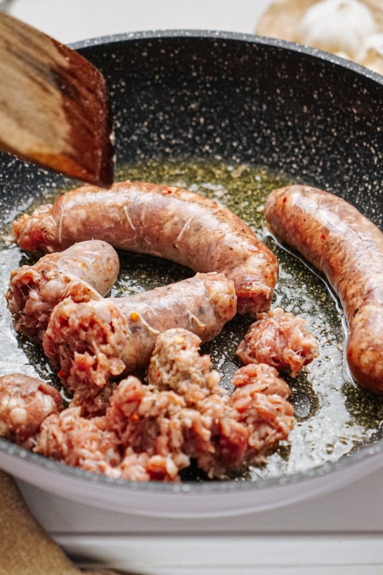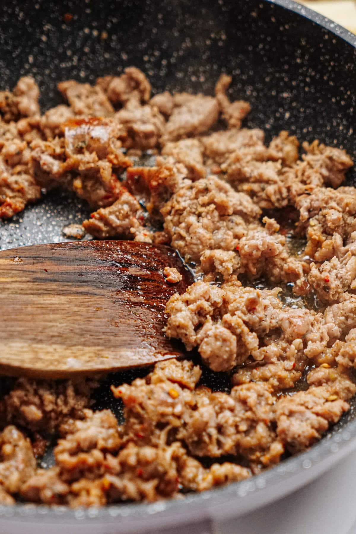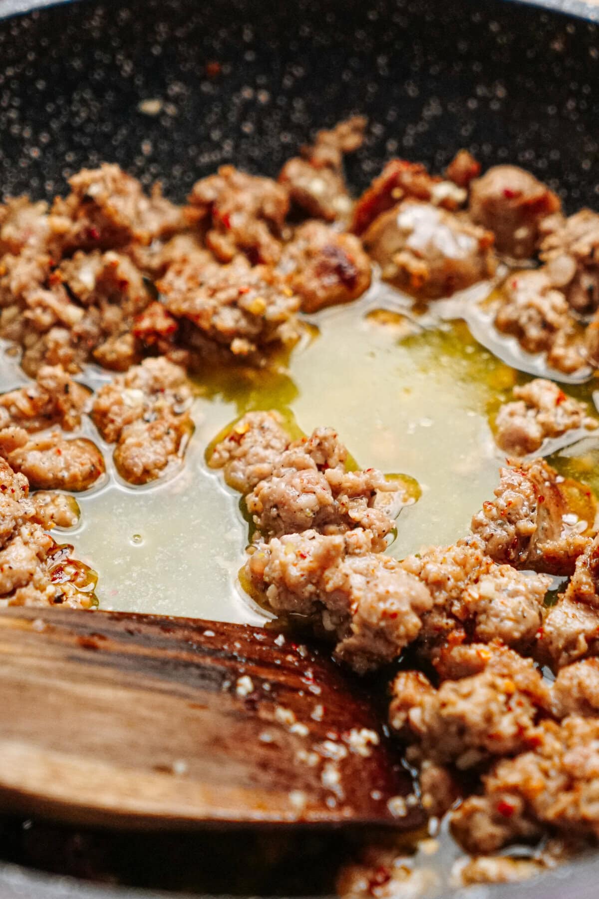 - Add olive oil to a large heated skillet. Over medium-high heat, cook Italian Sausage, breaking up with a wooden spoon to create small crumbles.