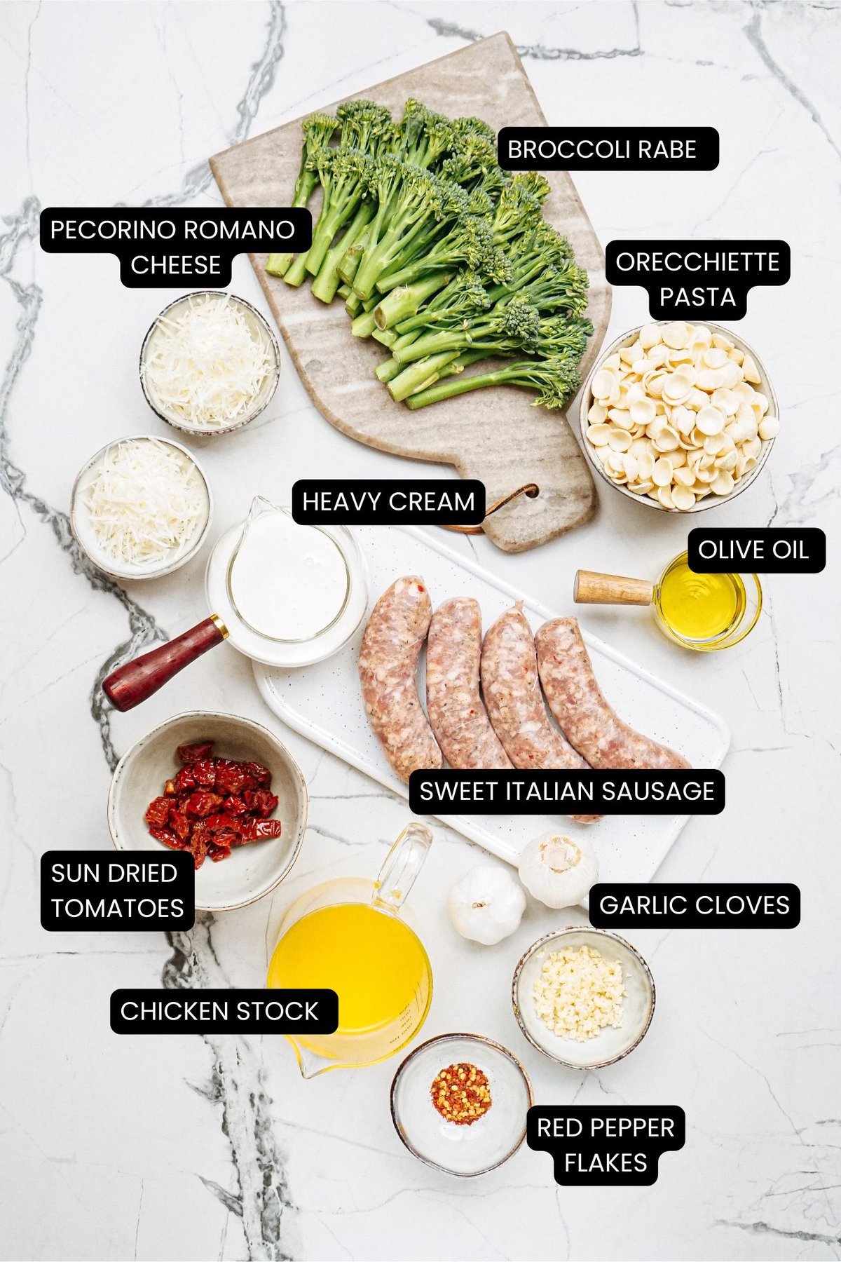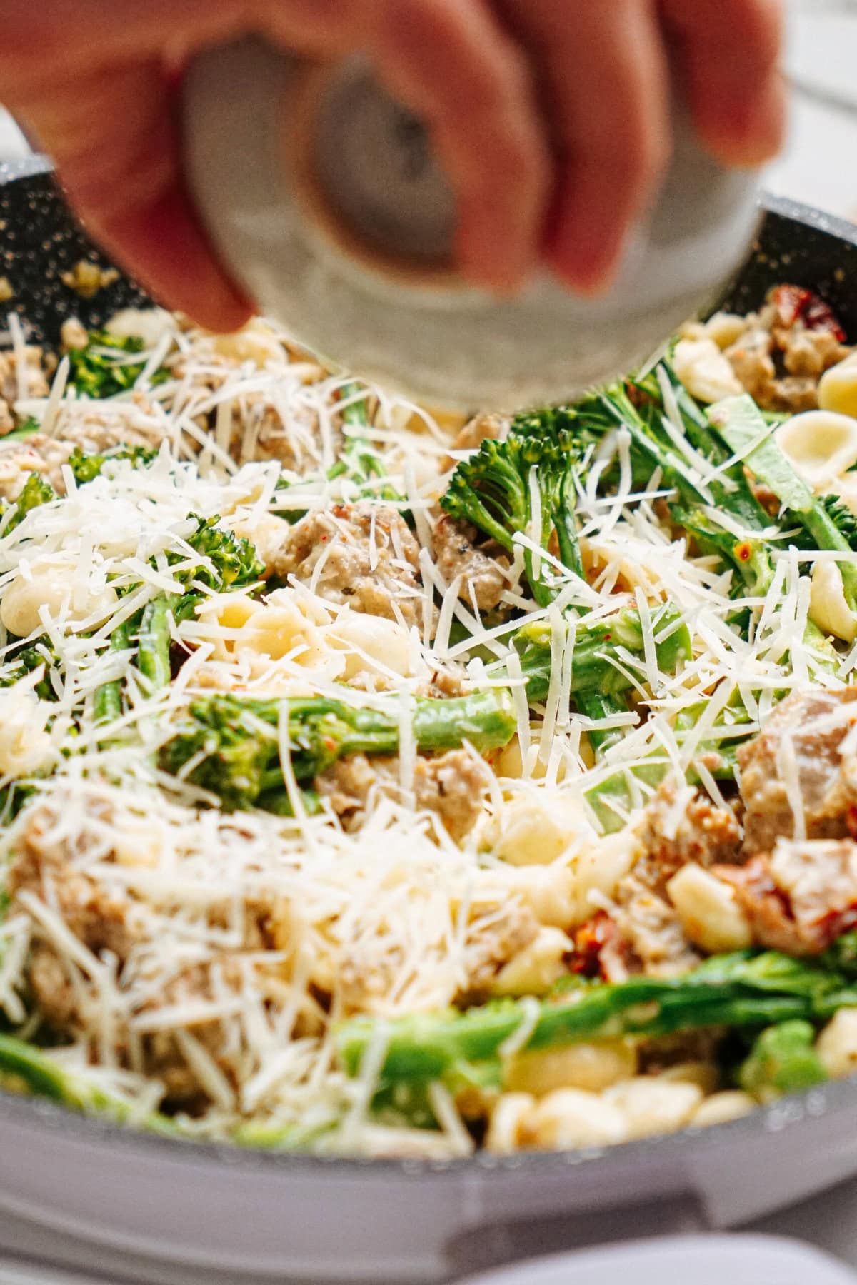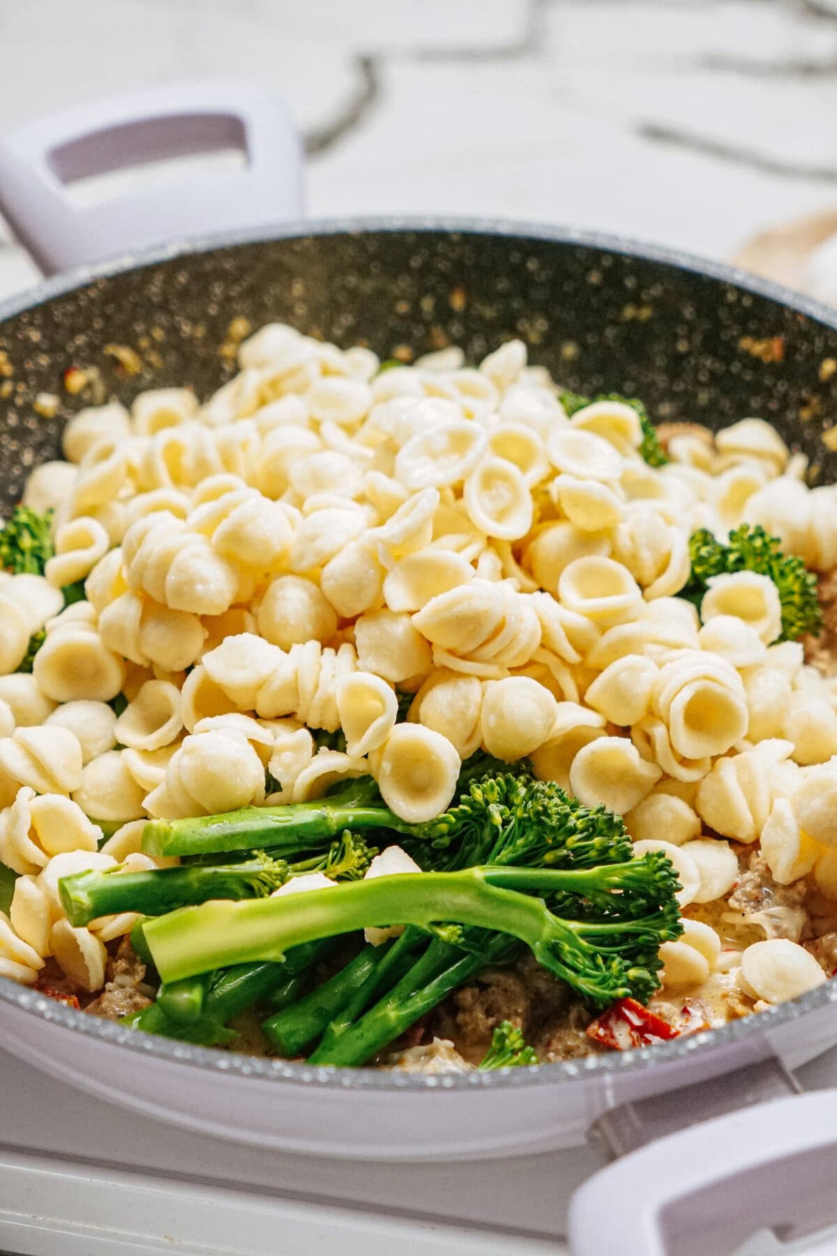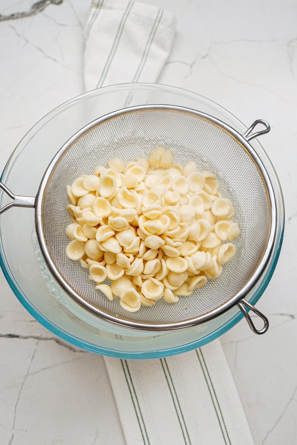 - Orecchiette pasta – This pasta shape catches all the bits of sausage and cheese perfectly. Other small pastas like shells work, too.