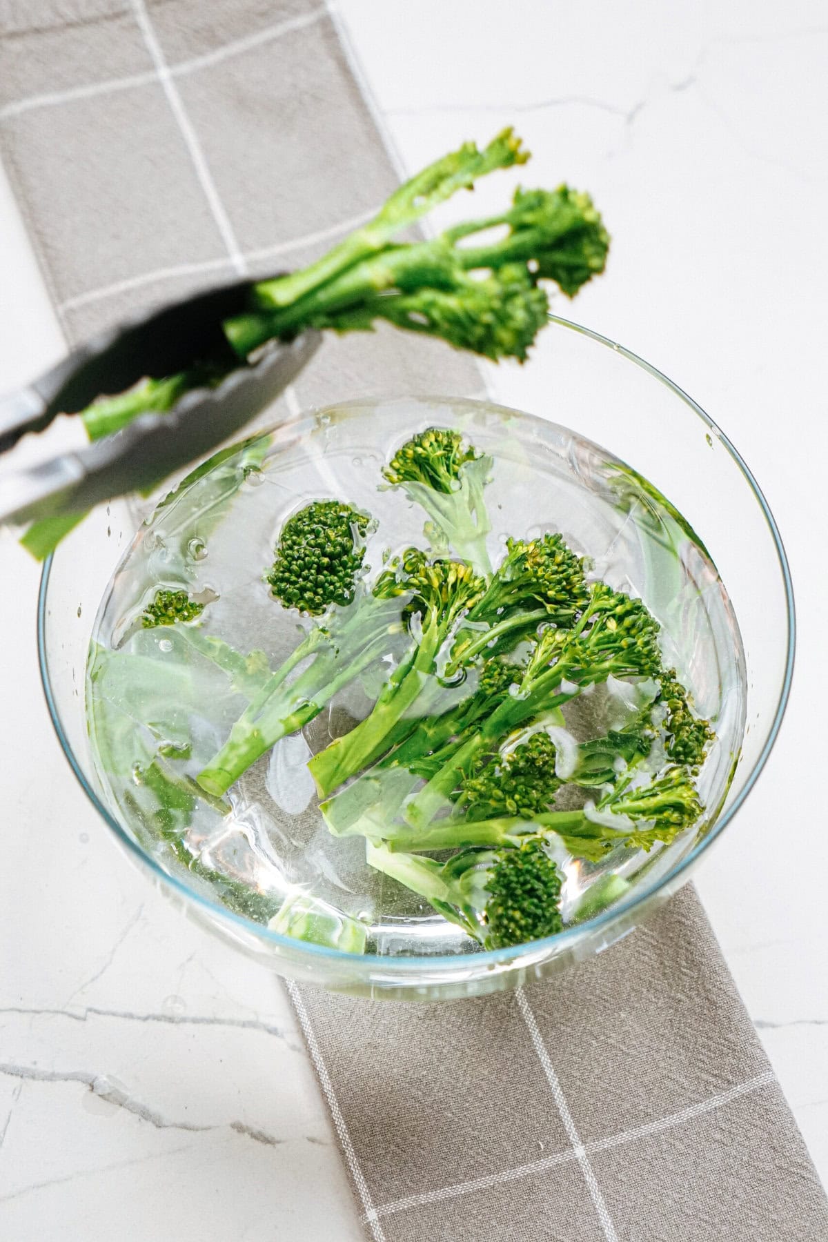 - Using a slotted spoon or tongs, remove broccoli rabe and place in a bowl of ice water. Set aside.