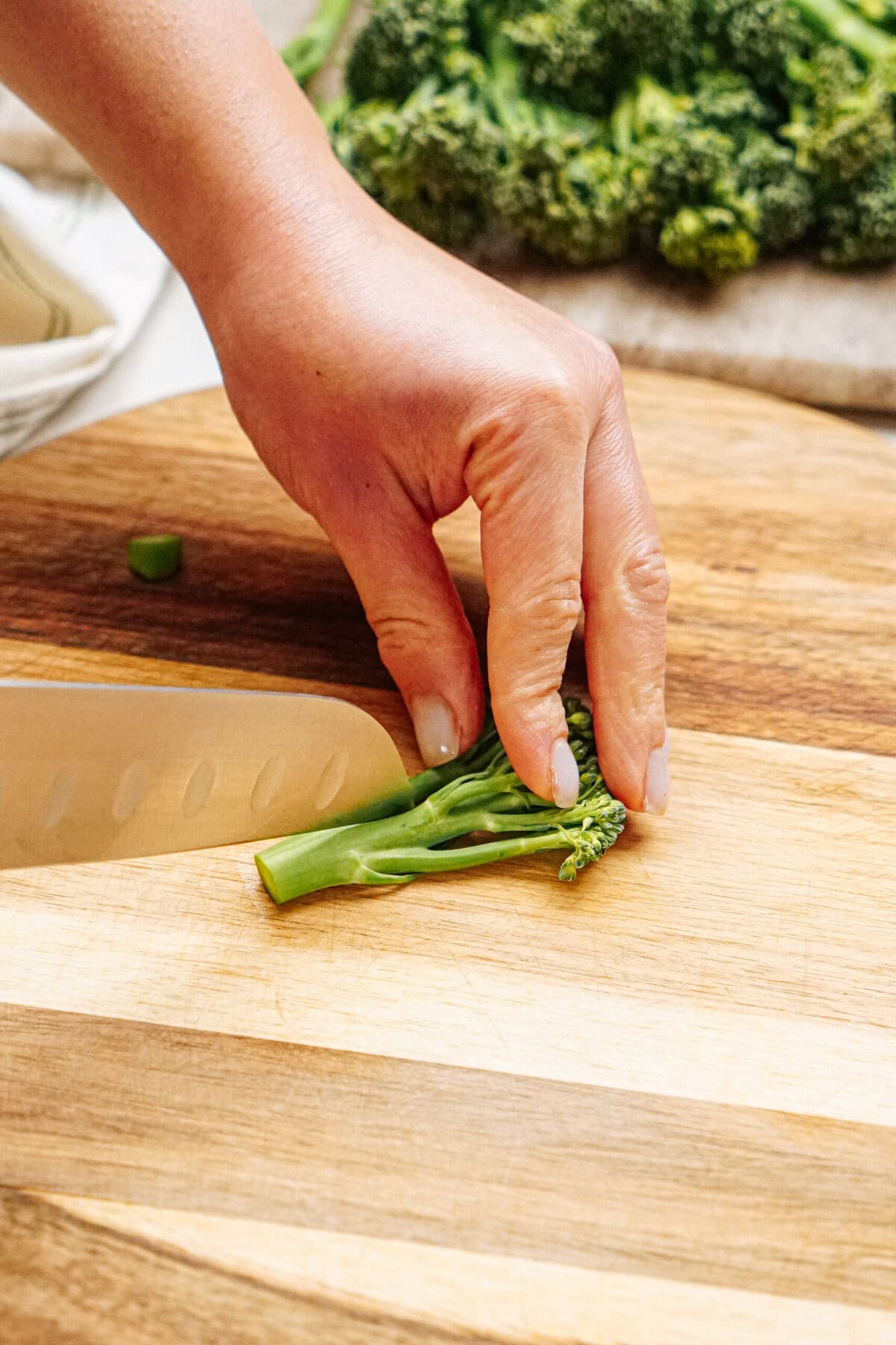 - Wash and trim (on an angle) just the ends of the stems of the broccoli rabe*. If you have thicker stalks, slice them in half lengthwise so all of your broccoli are similar in size.