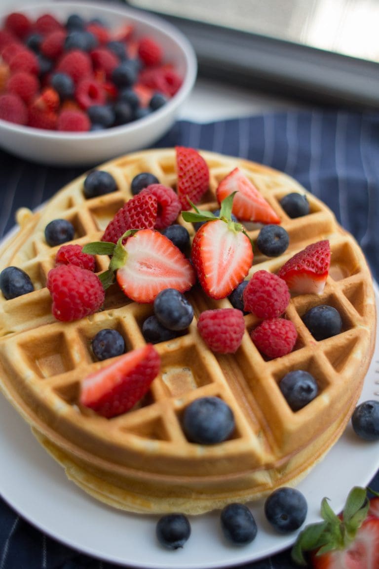 - Repeat with remaining batter until all waffles have been cooked. Serve warm with berries, whipped cream, powdered sugar, maple syrup and/or butter.