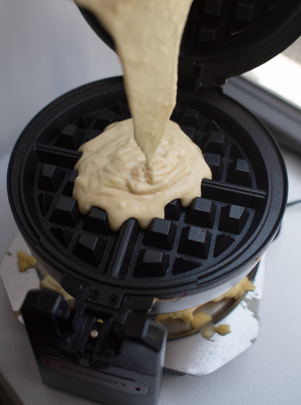 While I can appreciate why this is the traditional way, I have never noticed that big of a difference in the finished product between waffles with whipped egg whites and waffles without whipped egg whites. The most important thing you can do is make sure your waffle batter isn’t too thick so the baking powder and baking soda can work their magic and create a light waffle.