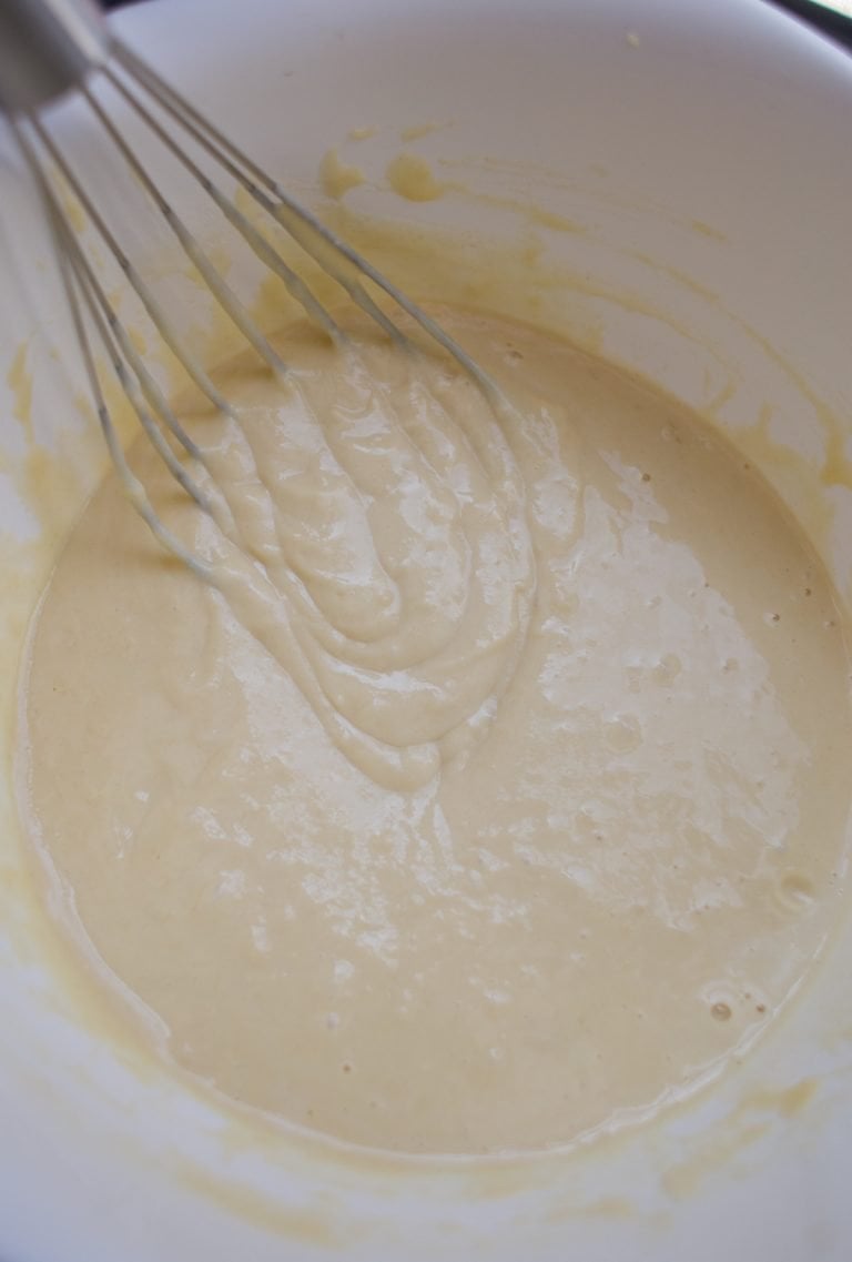 - Pour in remaining ingredients (milk, melted butter, vanilla extract, and egg yolks). Whisk to incorporate and create a batter.