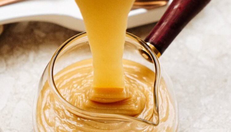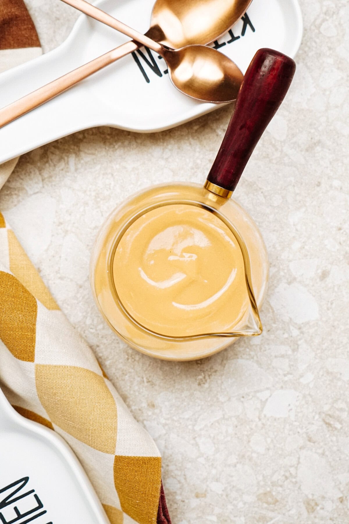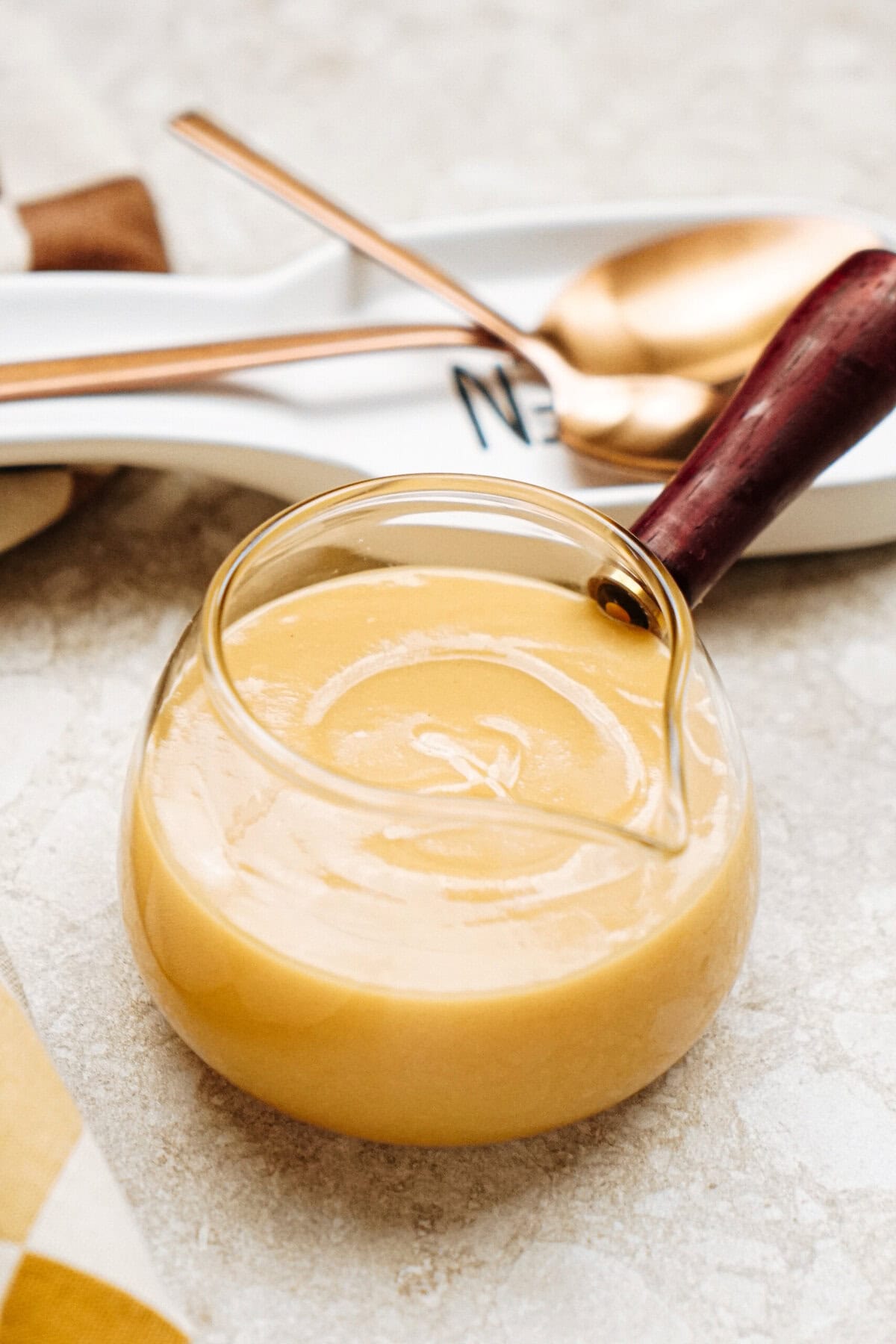 Thick golden sauce being poured from a jug into a round glass container with a spout.