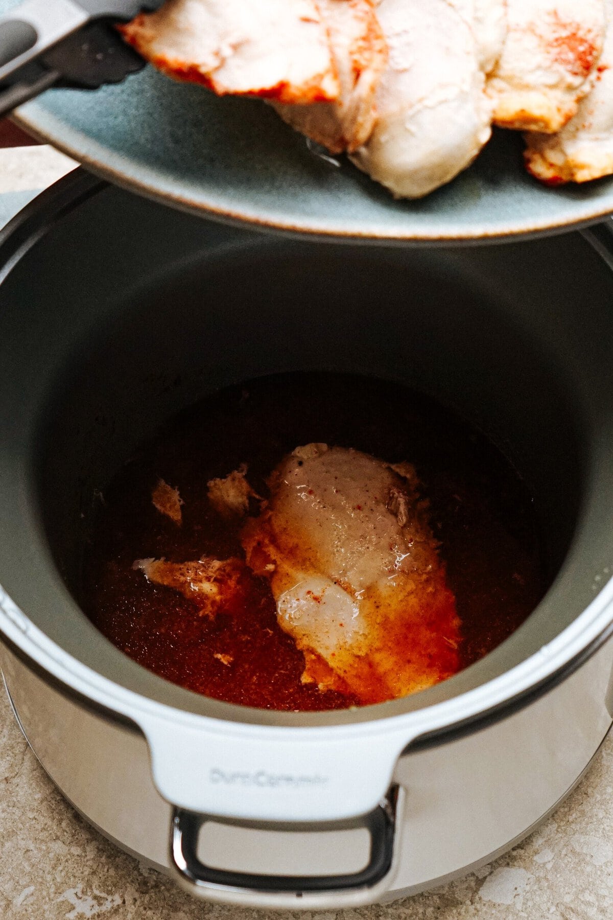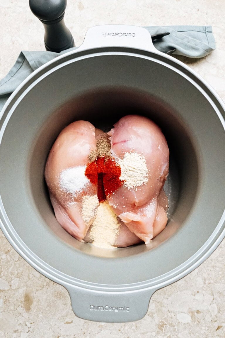 - Chicken broth – Keeps the chicken moist while adding richness. Water can work, but chicken broth gives the best results.