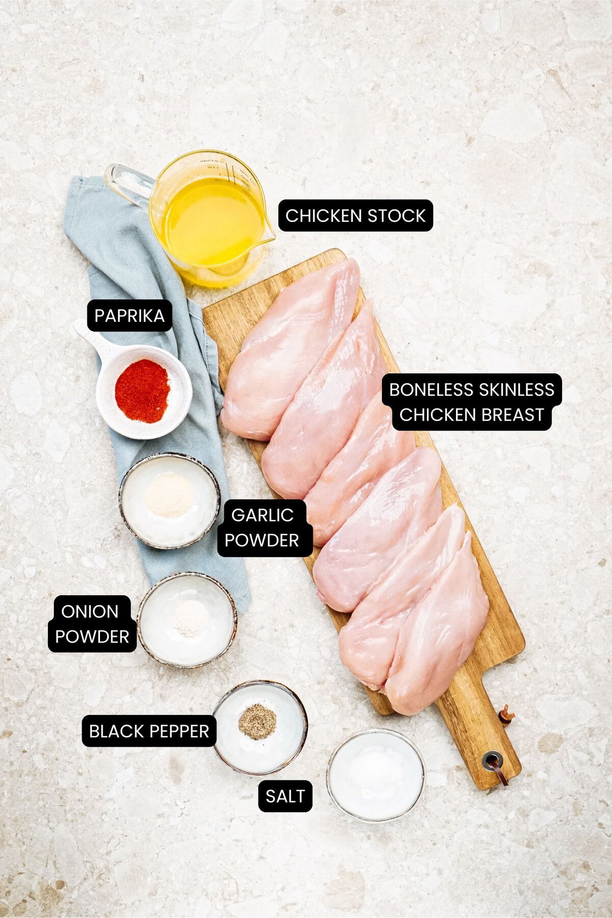 - Seasonings– salt, black pepper, garlic powder, onion powder, paprika