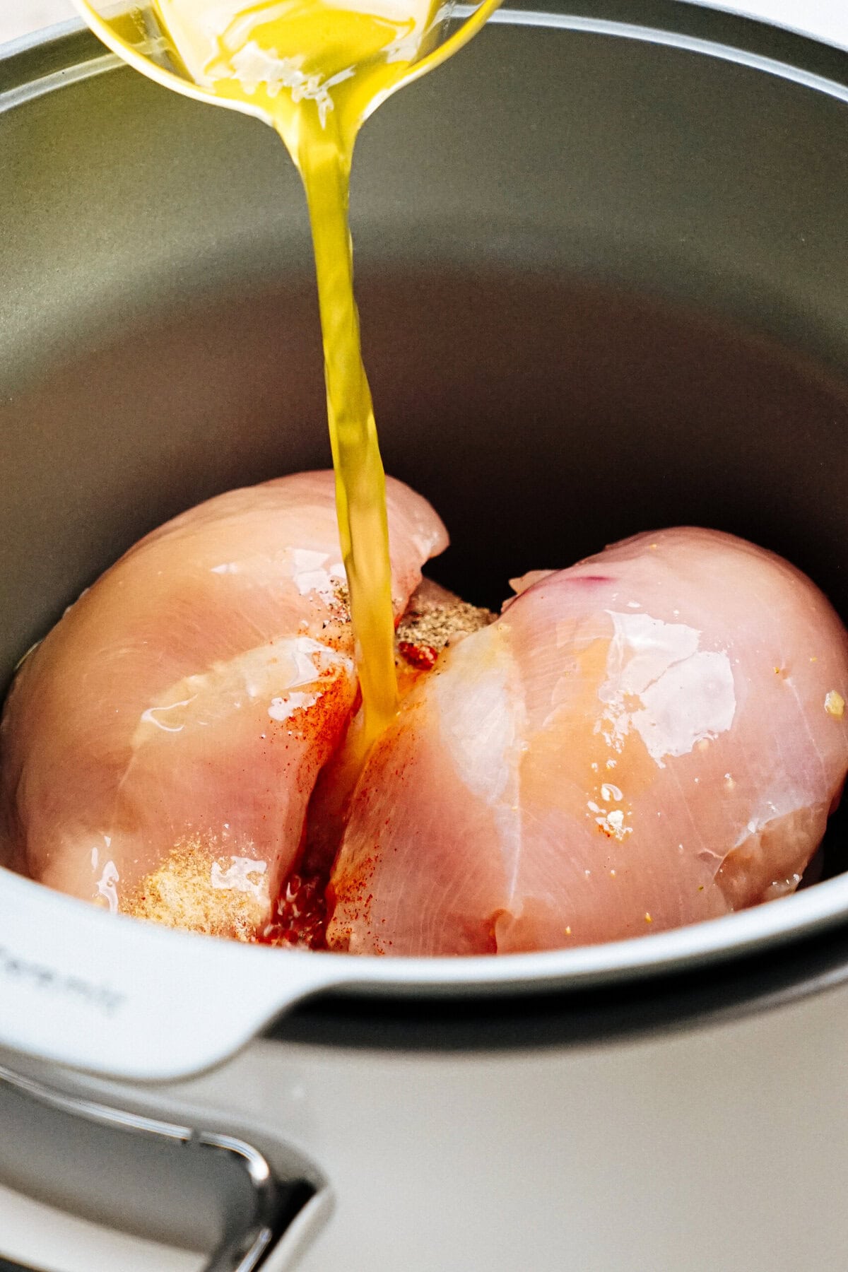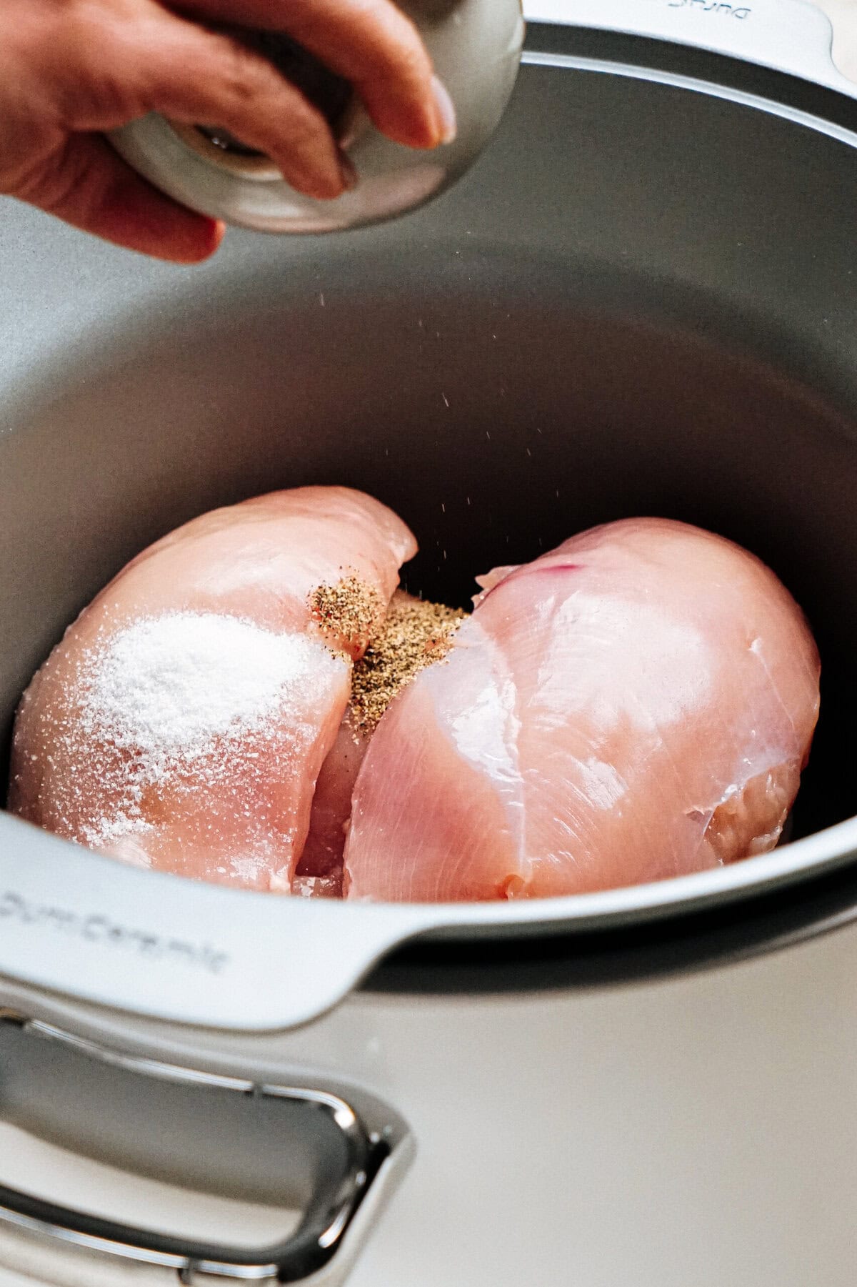 Add chicken breasts to the slow cooker and season with salt, pepper, and spices.