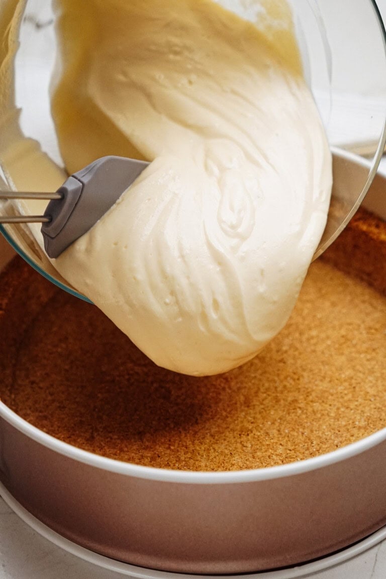 Pour HALF of the cheesecake filling into the center of the graham cracker crust and gently smooth the top if needed.