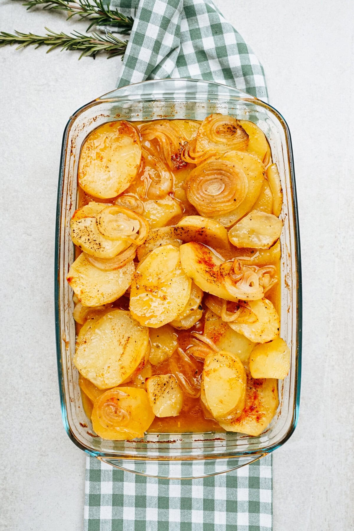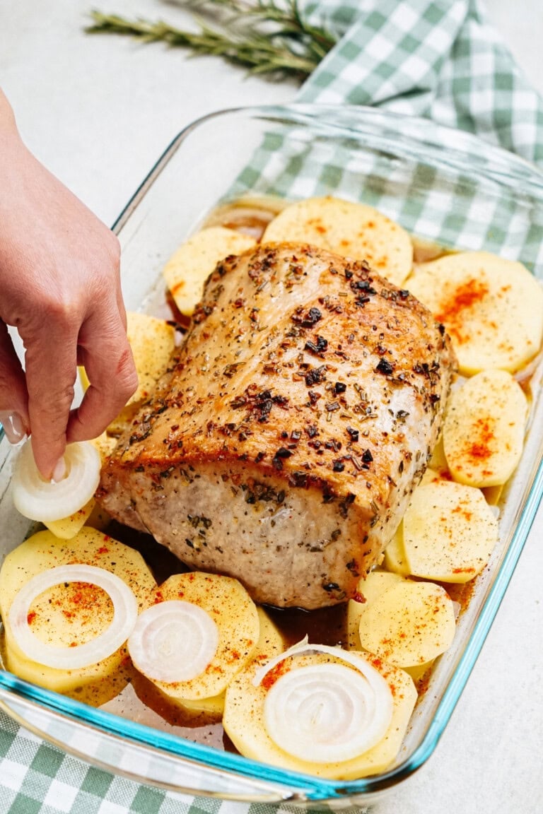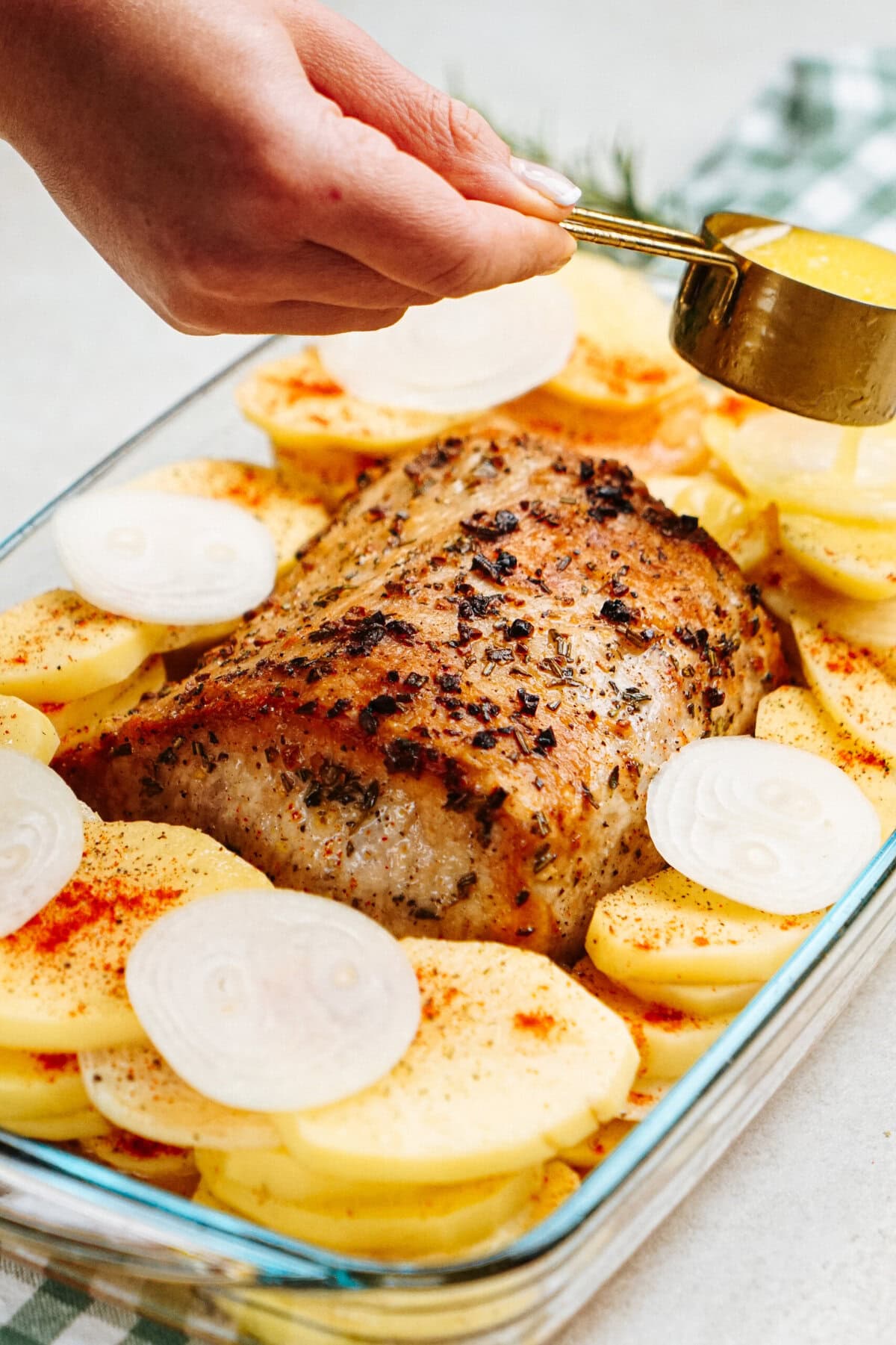 - Shingle potatoes around the roast to create two layers of potatoes. Season with salt and black pepper to taste, and paprika. Sprinkle on a few slices of onions and pour on more butter/stock mixture.
