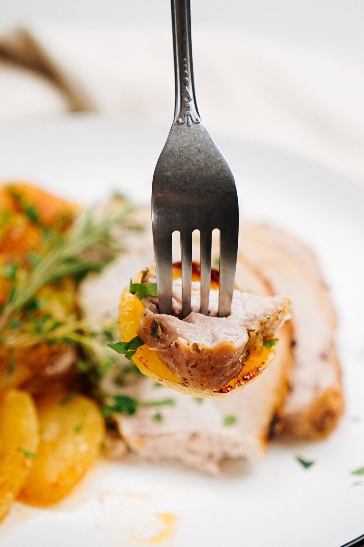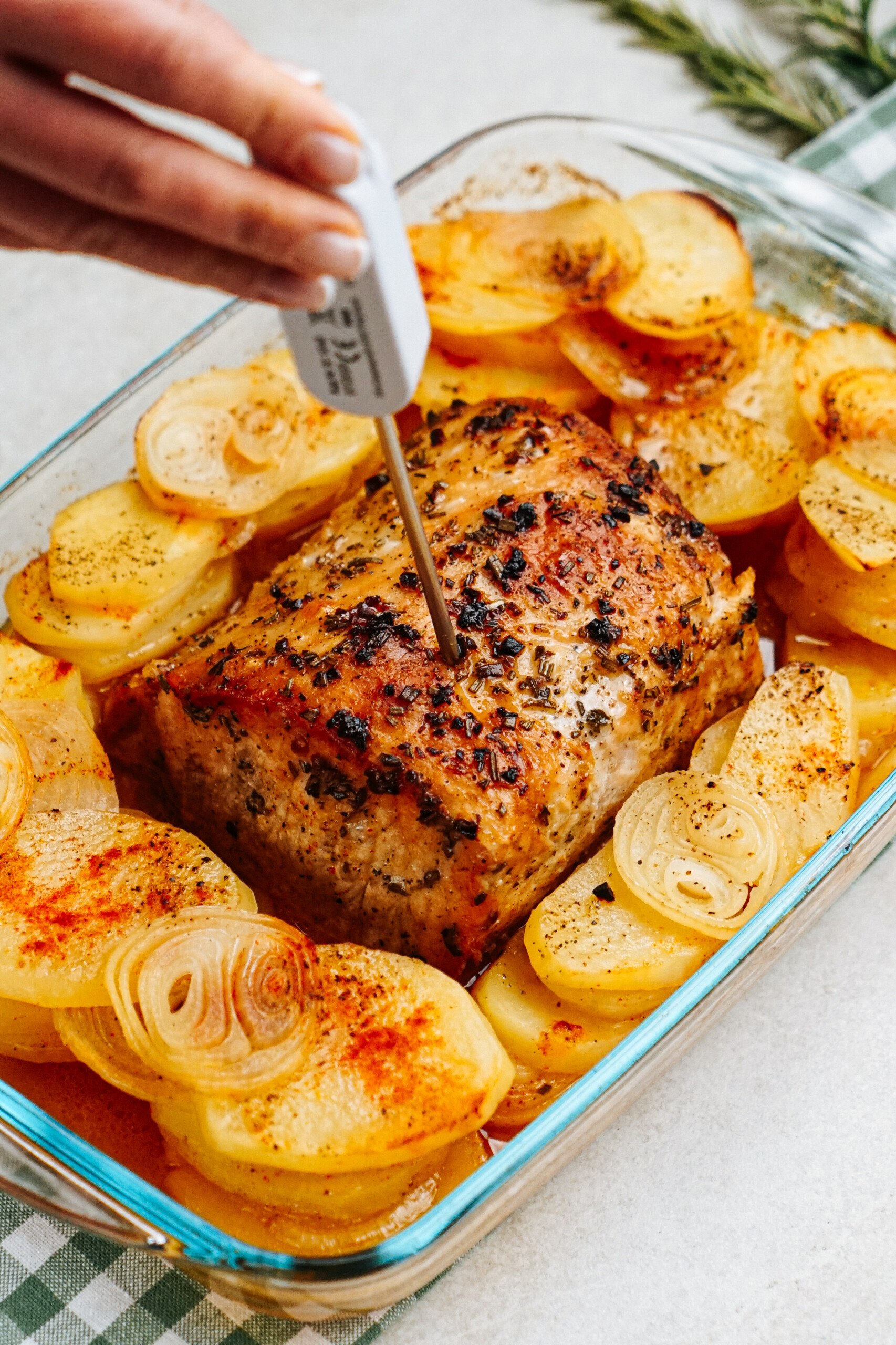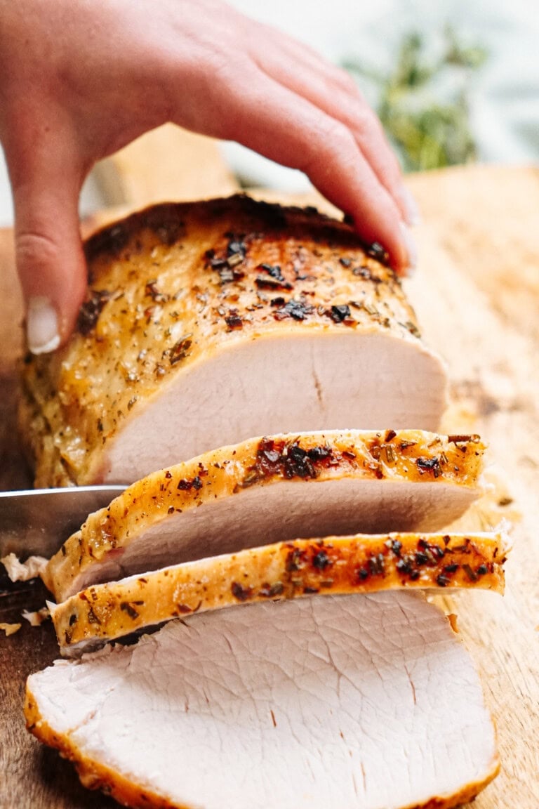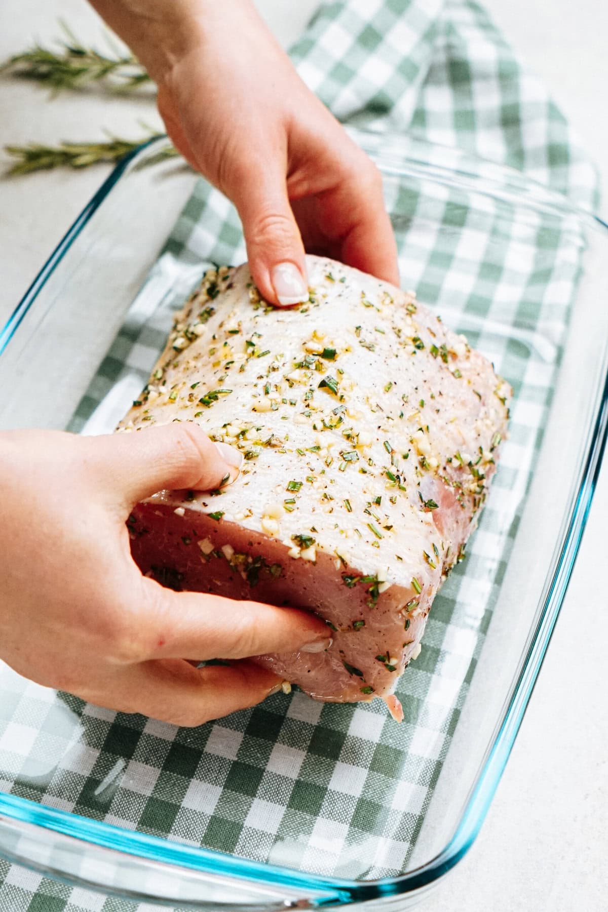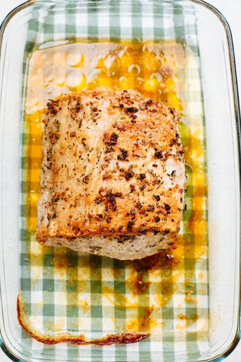 - Boneless pork loin roast – a lean cut of meat with a layer of fat on top helps lock in moisture