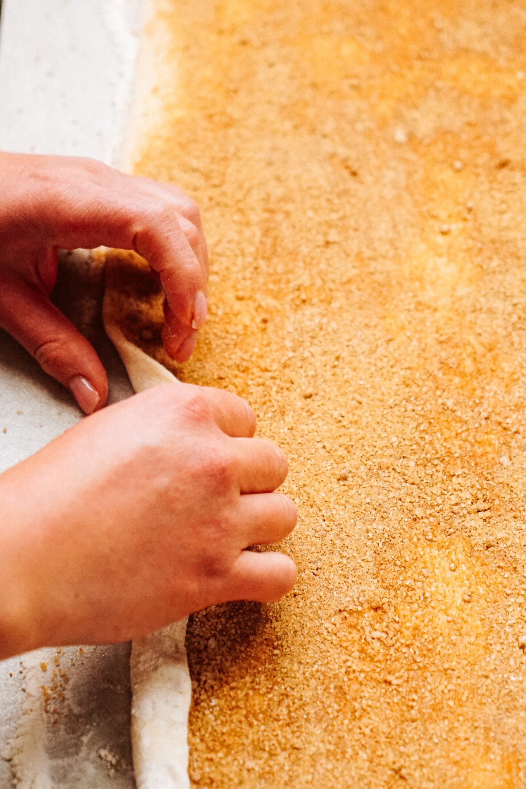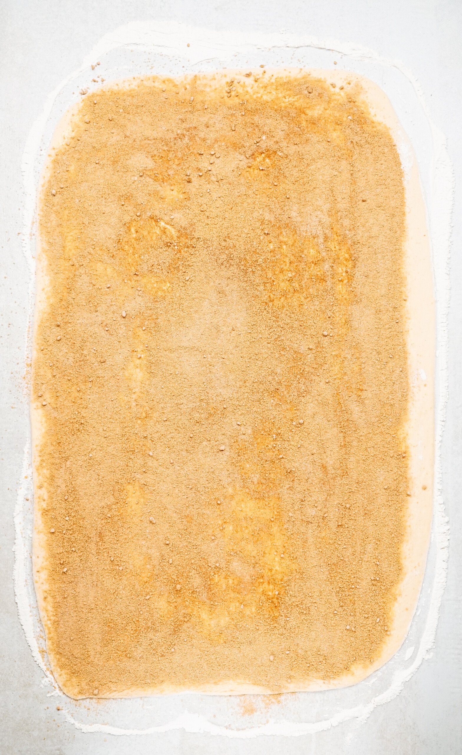 - Spread softened butter over dough, being sure to go right to the edges leaving a 1-inch strip untouched on one of the longer sides of dough. Dump brown sugar mixture onto the middle of the dough and spread with your hands, creating an even layer over top of the butter, still leaving that 1-inch strip of dough untouched. If you have any filling that falls off the sides of the dough, use a bench scraper to replace. Lightly press the sugar mixture into the butter using a rolling pin.