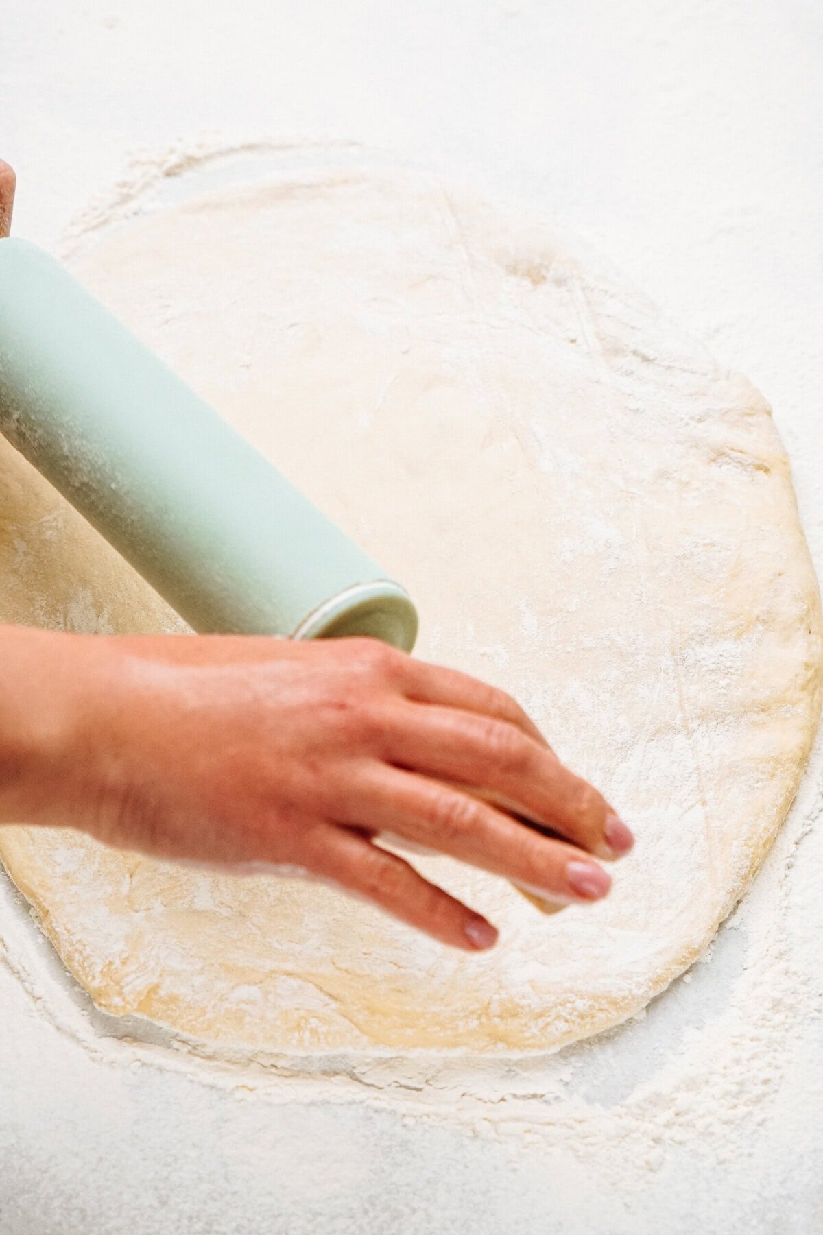 - Punch down dough. Flour a large clean table liberally with flour. Lightly flour dough as well. Roll dough out to be a 20×30 rectangle {or as close to that as possible} while moving dough around to ensure it’s not sticking to your work surface. If it’s a little short or uneven, feel free to cut off the edges to even it all out.