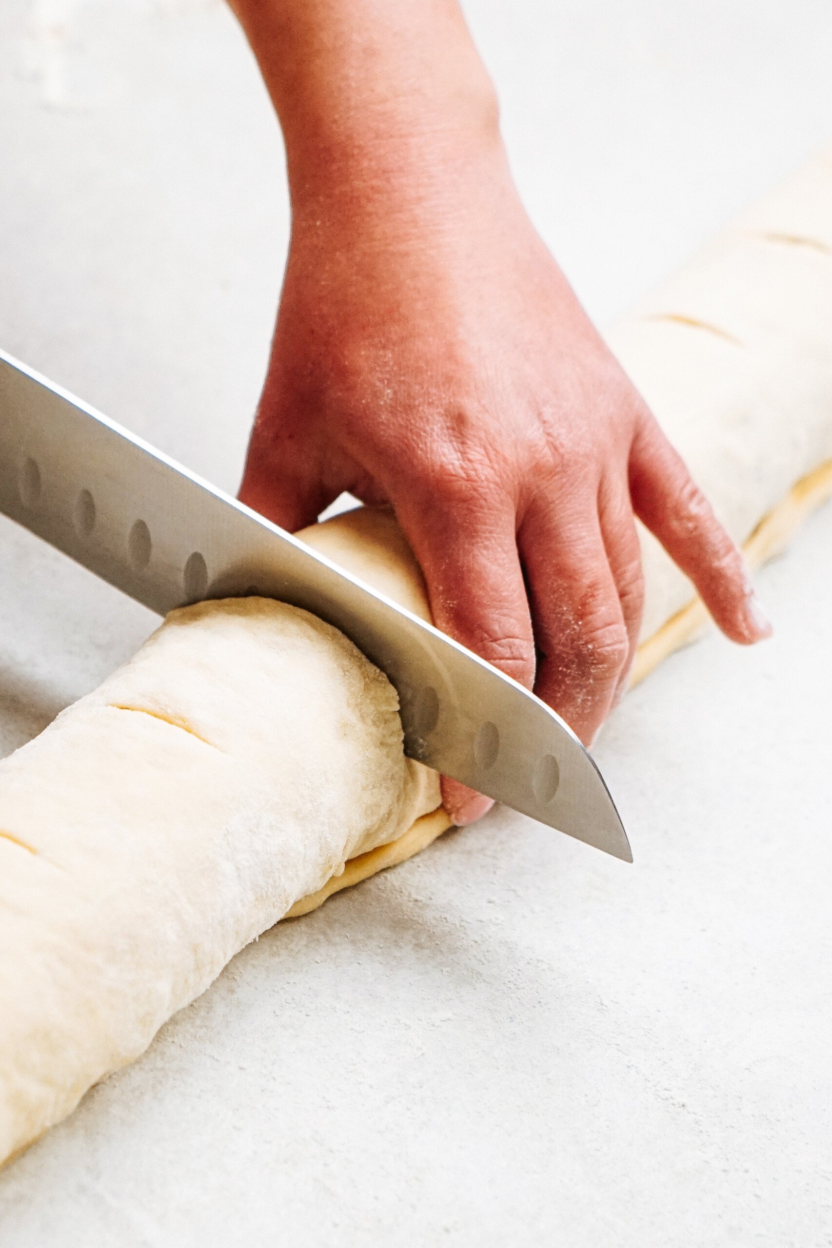 - Roll the dough up into a tight log, finishing with the plain dough on the bottom to seal the entire thing together. Cut off the uneven ends to even out the log. Score log every 2 inches and then slice your rolls using those marks. Place onto parchment paper lined, butter greased pans. 12 into a 9×13, 3 remaining into a loaf pan, or 8×8 with the small ends. Cover pans with plastic wrap and dish towels.