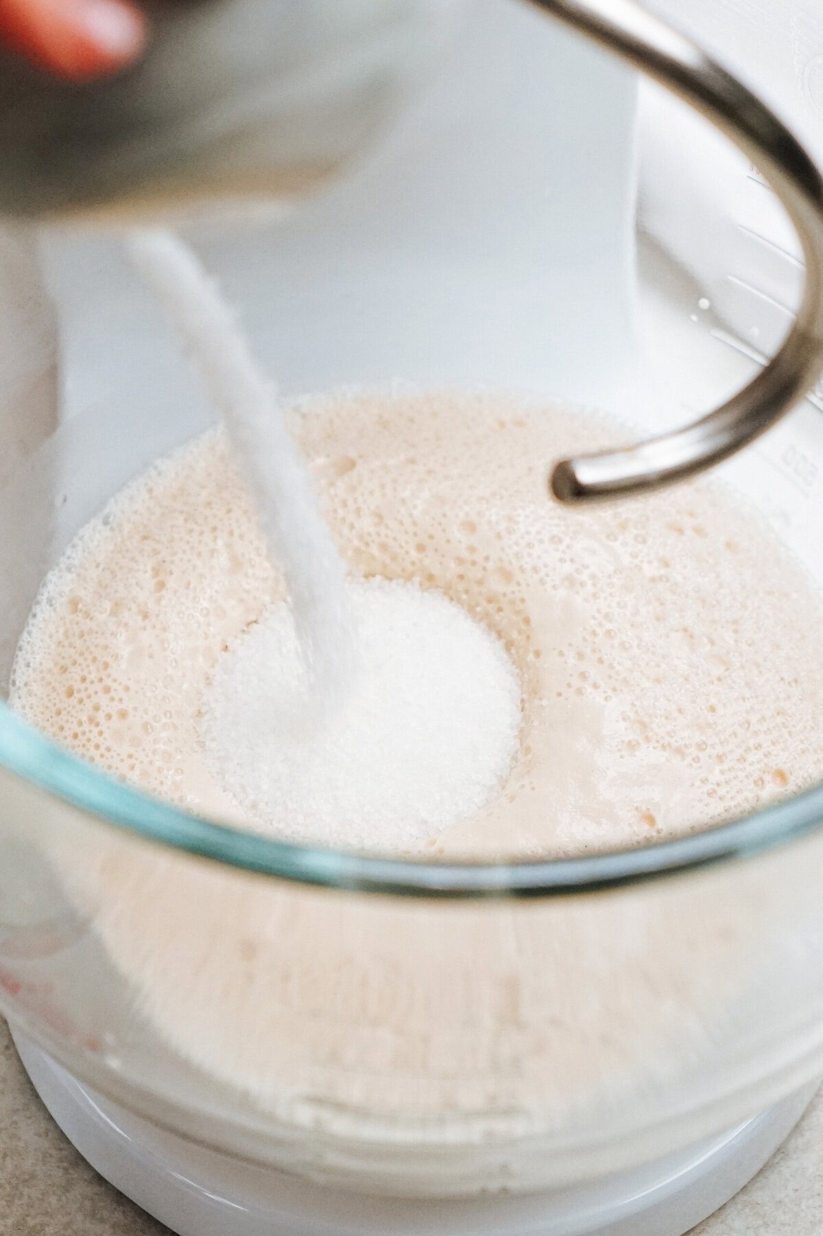 - Once the mixture looks bubbly and frothy, pour in remaining sugar. Stir on low for 15-20 seconds. In a small bowl, measure buttermilk, oil, and egg. Whisk ingredients together until egg is incorporated to other two ingredients. Pour contents into the water and yeast mixture. Stir another 20 seconds in the mixer.
