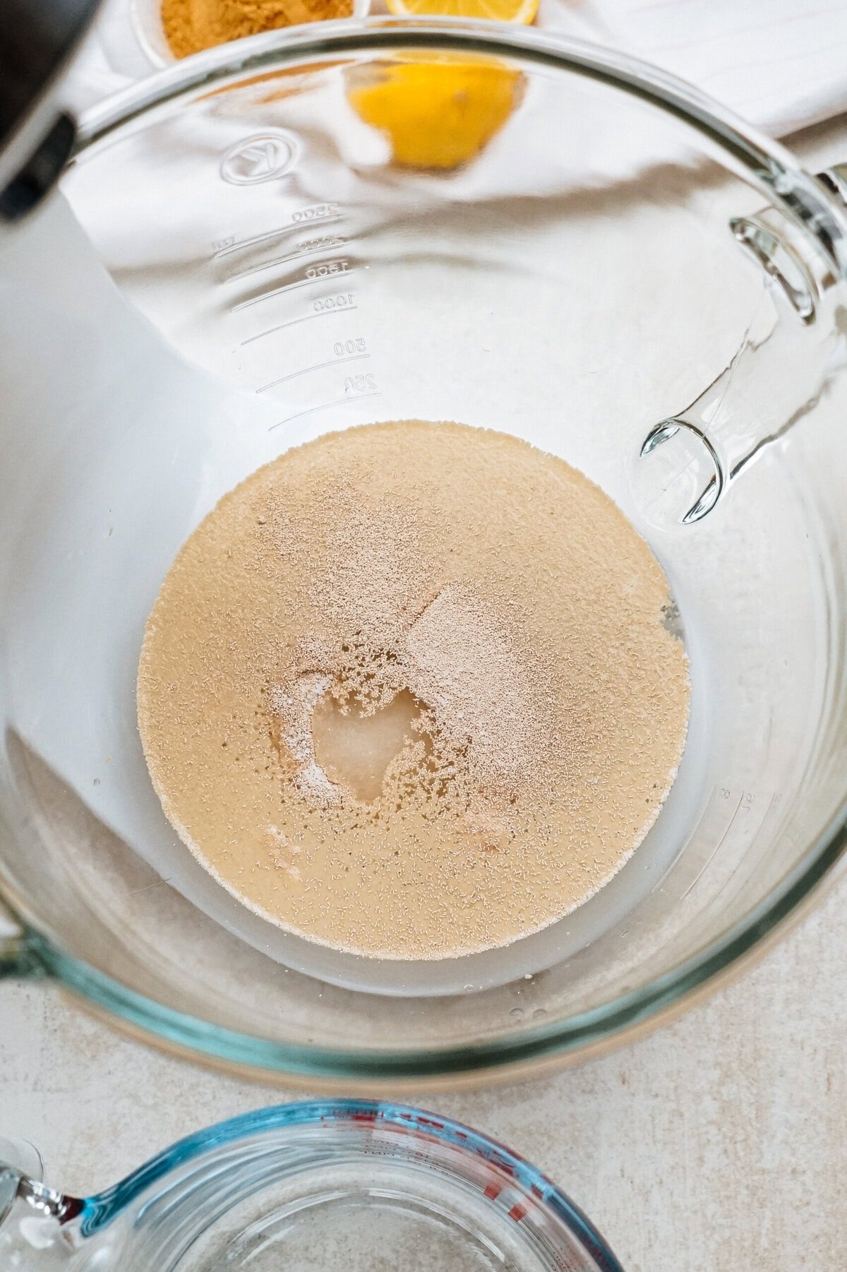 • In the bowl of a stand mixer fitted with a dough hook, pour in water, yeast and 1 tablespoon of the granulated sugar. Stir and proof 5 minutes.