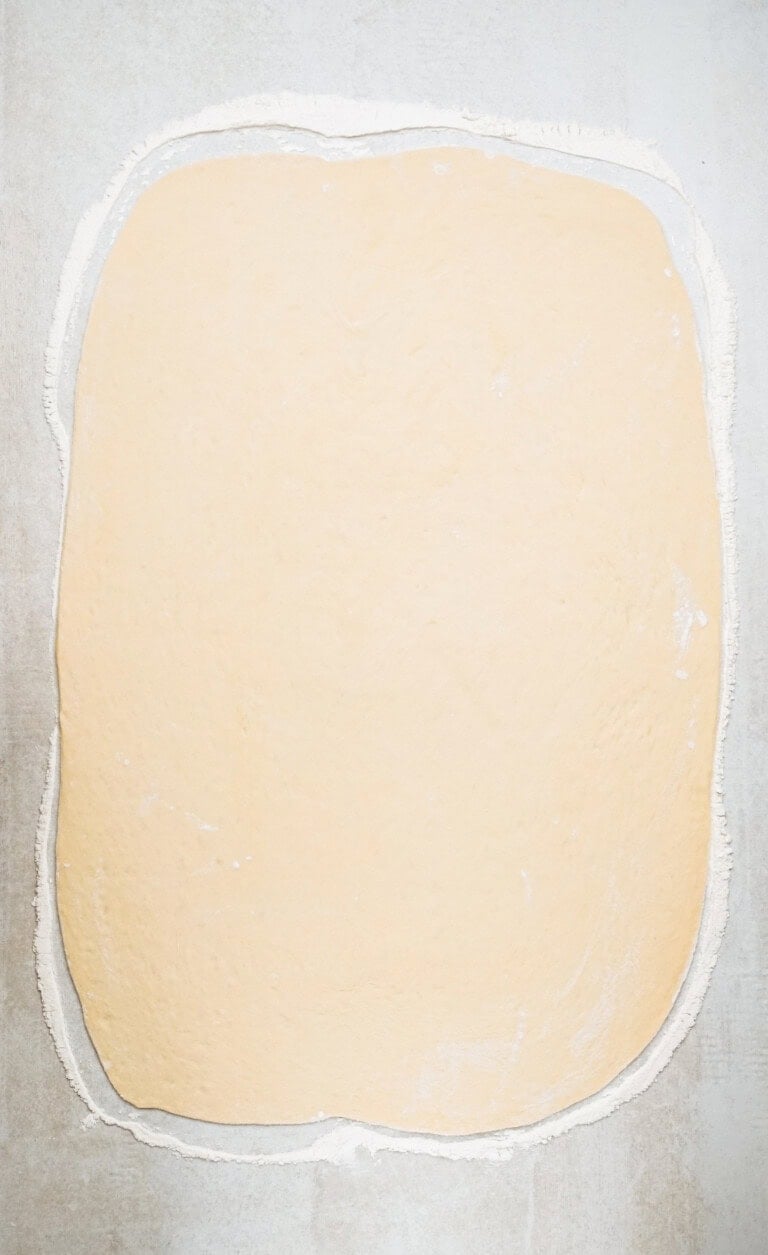 • Punch down dough. Flour a large clean table liberally with flour. Lightly flour dough as well. Roll dough out to be a 20×30 rectangle {or as close to that as possible} while moving dough around to ensure it’s not sticking to your work surface. If it’s a little short or uneven, feel free to cut off the edges to even it all out.