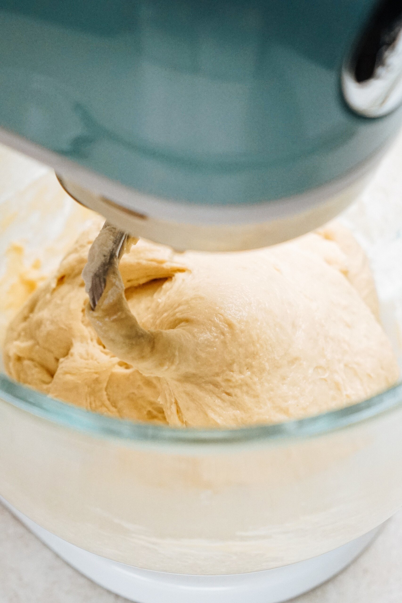 Kneading dough in a stand mixer is an efficient way to make any kind of bread dough, however, it can get *too* efficient and there is a tendency to add in too much flour. It should still stick to the bottom of the bowl, but pull away from the sides. Also, when you feel it, it should be tacky but not enough to stick to your hands and leave a residue. Kneading the cinnamon roll dough by hand is a great way to ensure the dough doesn’t get over kneaded.