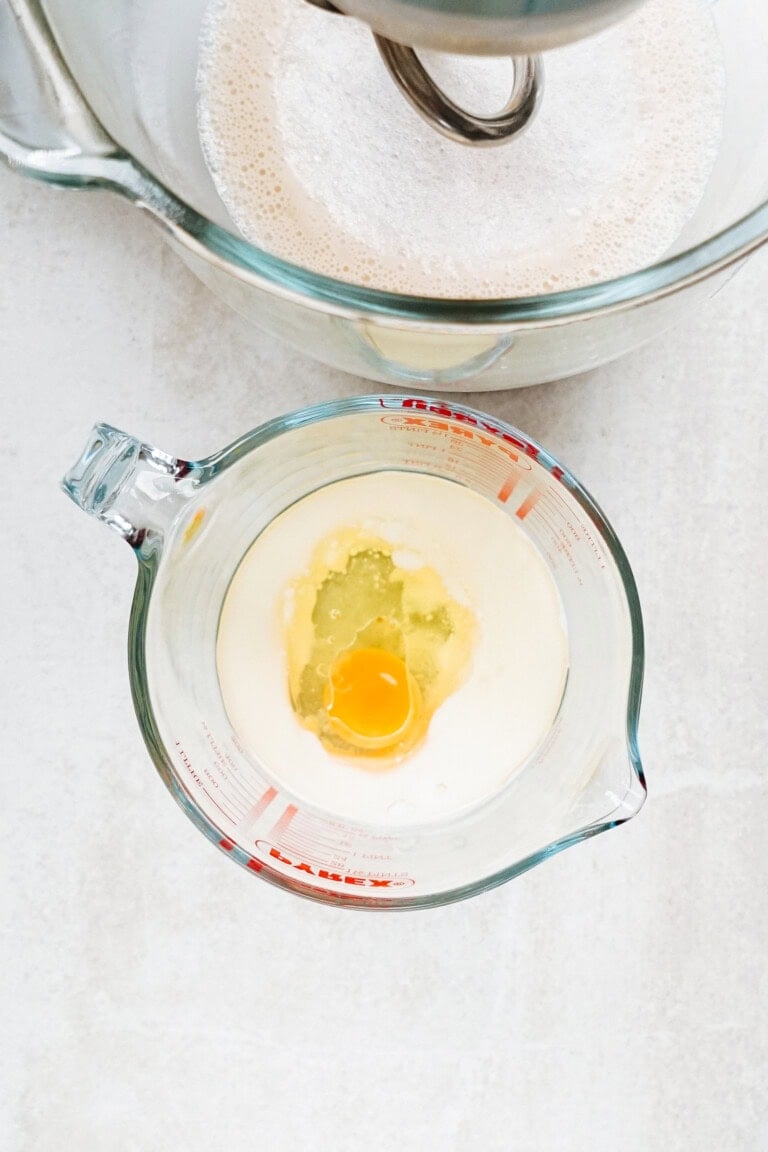 • Once the mixture looks bubbly and frothy, pour in remaining sugar. Stir on low for 15-20 seconds. In a small bowl, measure buttermilk, oil, and egg. Whisk ingredients together until egg is incorporated to other two ingredients. Pour contents into the water and yeast mixture. Stir another 20 seconds in the mixer.