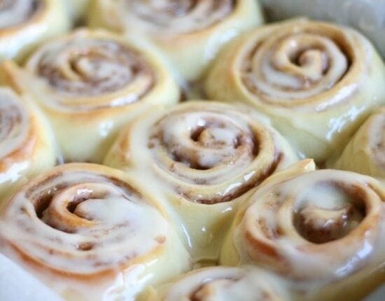 Typically, cinnamon rolls stay raw in the middle for two reasons: (1) they were rolled too tightly and never had a chance to rise in the middle OR (2) they need more time in the oven to bake. How do we fix this? Roll your cinnamon rolls to be tight enough to maintain their shape, but not so terribly tight that the dough can’t rise. Practice does make perfect! Also, be sure to make your rolls in the bottom third of the oven.