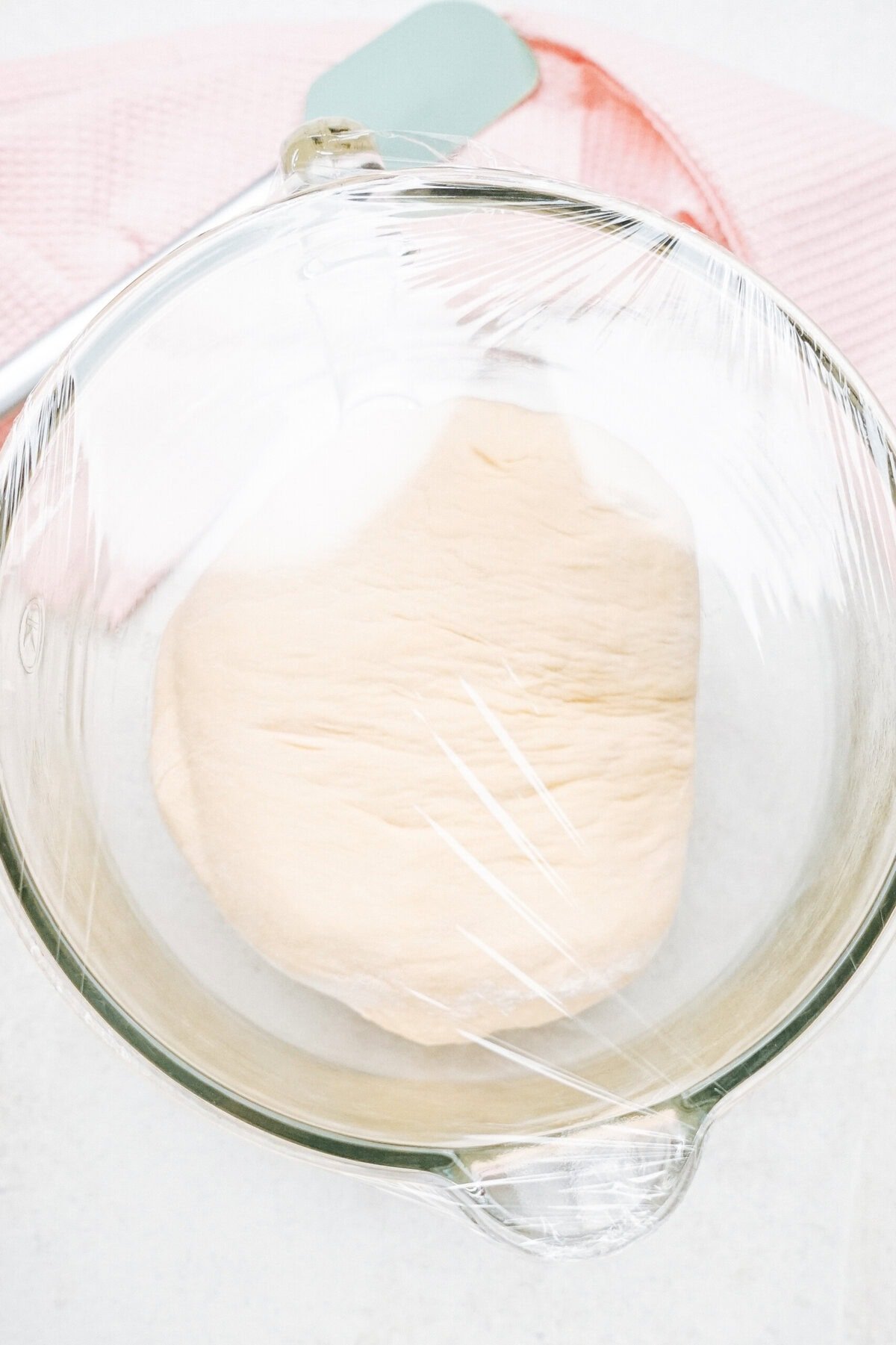 • Remove dough from bowl, grease and replace back into same mixing bowl {since it’s practically clean anyways.} Cover with plastic wrap and a dish towel. Rise 1-2 hours or until the dough has doubled in size.