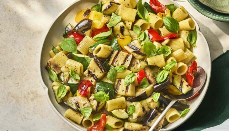 Smoky onions, eggplant, and zucchini come together with mezze rigatoni in this flavor-packed pasta salad.