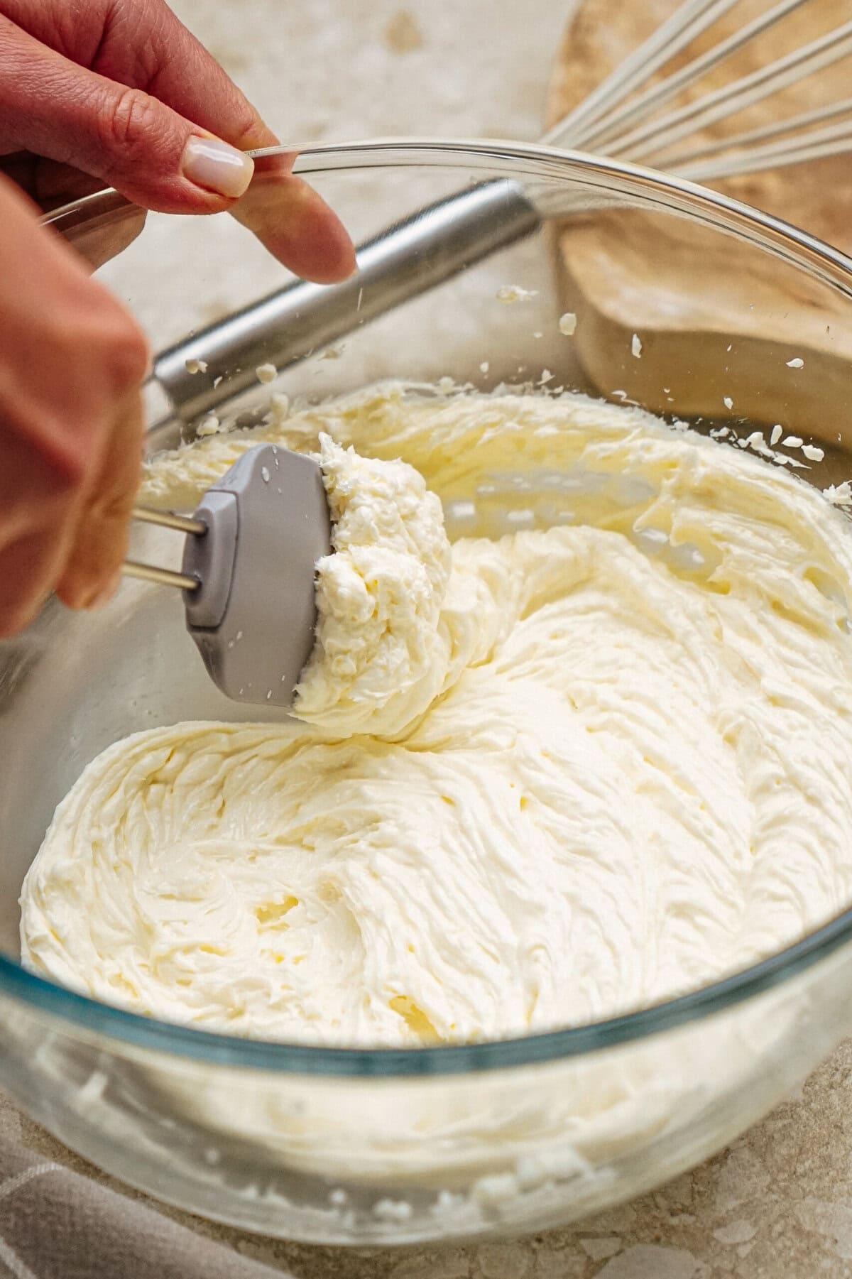 - Be sure to use room temperature cream cheese and blend with sugar and vanilla to get a smooth base to mix the whipped cream into. Next, using COLD heavy whipped cream, slowly incorporate it by thirds into the cream cheese mixture, letting it mix in completely and scraping the sides of the bowl after each addition. Once all the whipped cream has been incorporated, you want to whip it until its thick enough to hold its shape, completely smooth and creamy. You’re essentially whipping the cream within the cream cheese mixture.