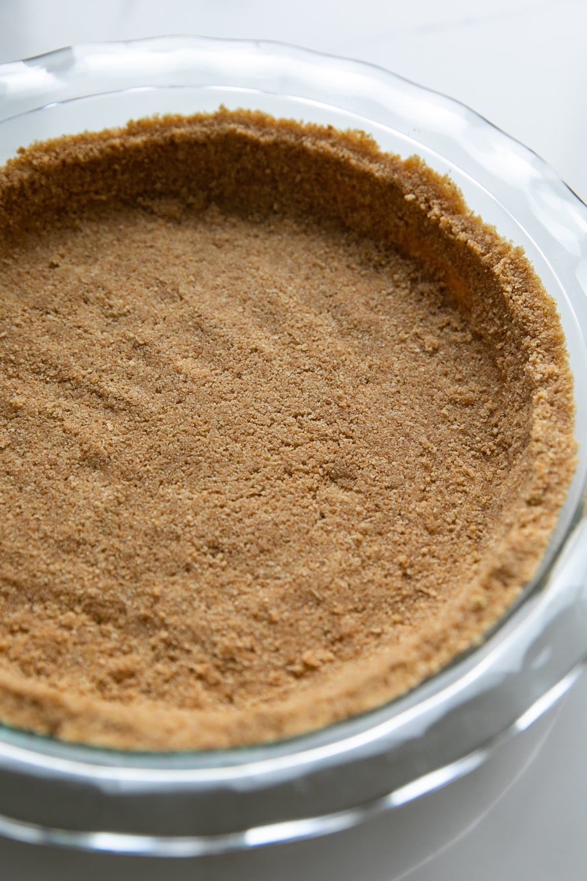 Stir melted butter together with graham cracker crumbs and a touch of sugar. Be sure every crumb is coated in butter to ensure your crust sticks together. Press into a pie pan and refrigerate. This is super easy to do with the bottom of a measuring cup.