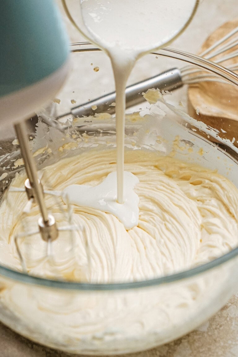 - With the mixer on, add cream in four increments, letting it whip into the cream cheese after each addition. Whip 1 minute until thick and light. Scrape the sides to ensure even mixing and whip again if needed.