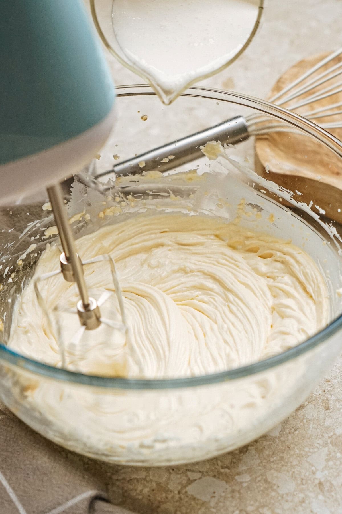 With the mixer on, add heavy cream in four increments, letting it whip into the cream cheese after each addition. Whip 1 minute until thick and light. Scrape the sides to ensure even mixing and whip again if needed.