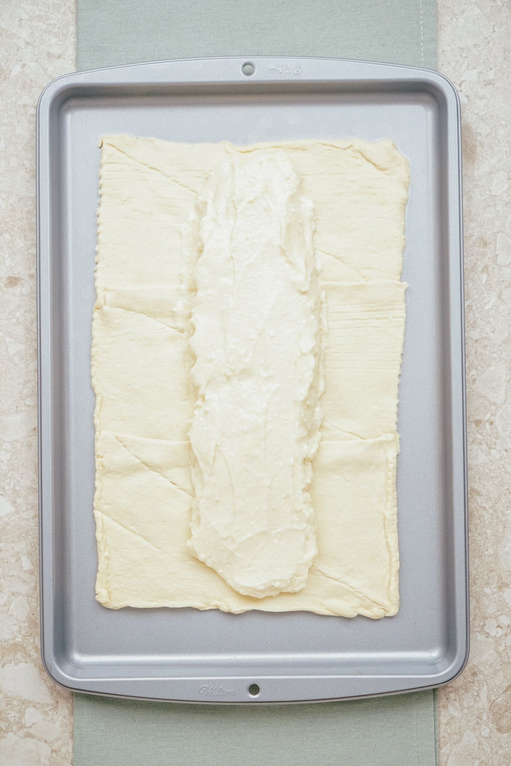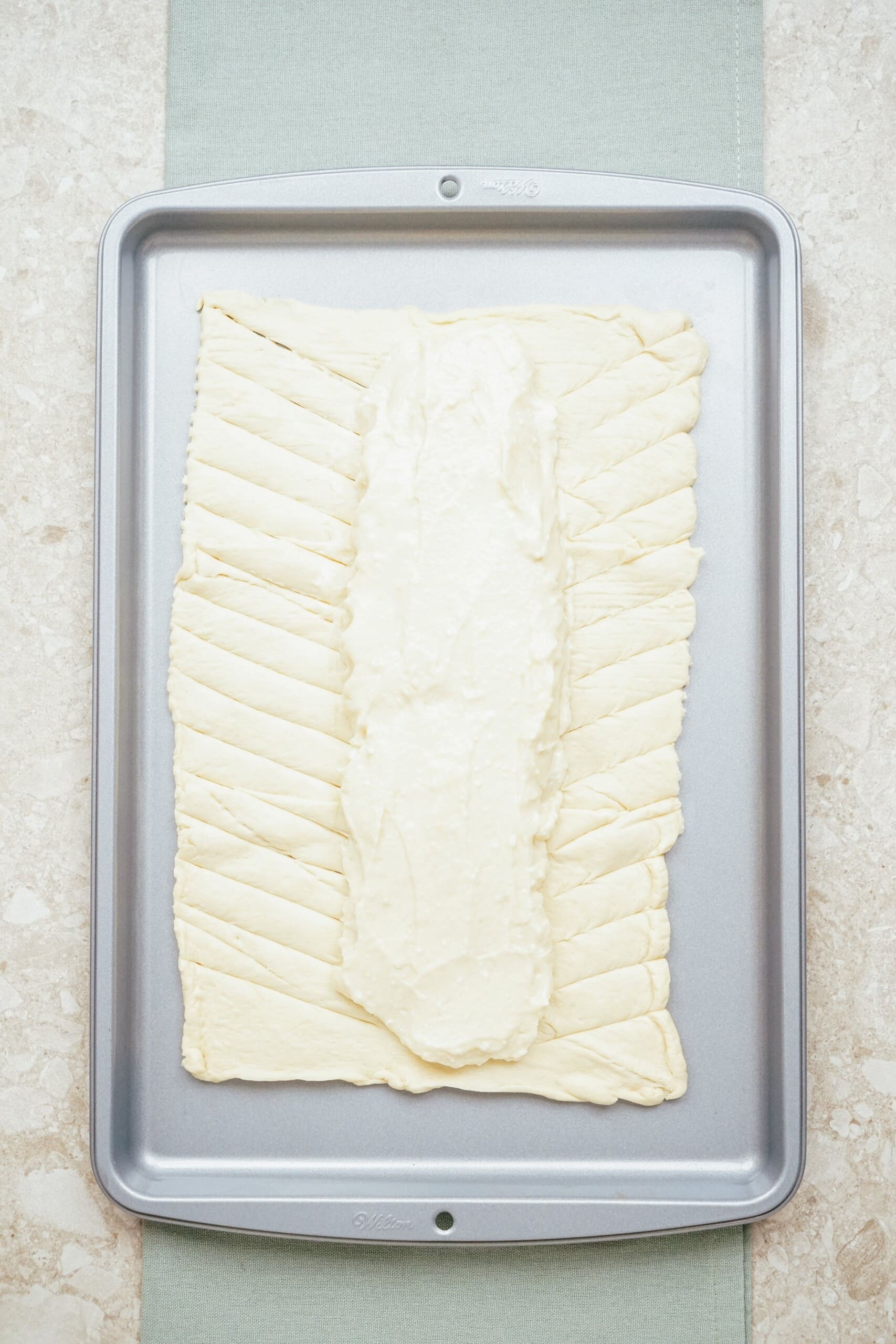 Carefully spread cream cheese filling down the center of the dough to be about 2-3 inches wide.