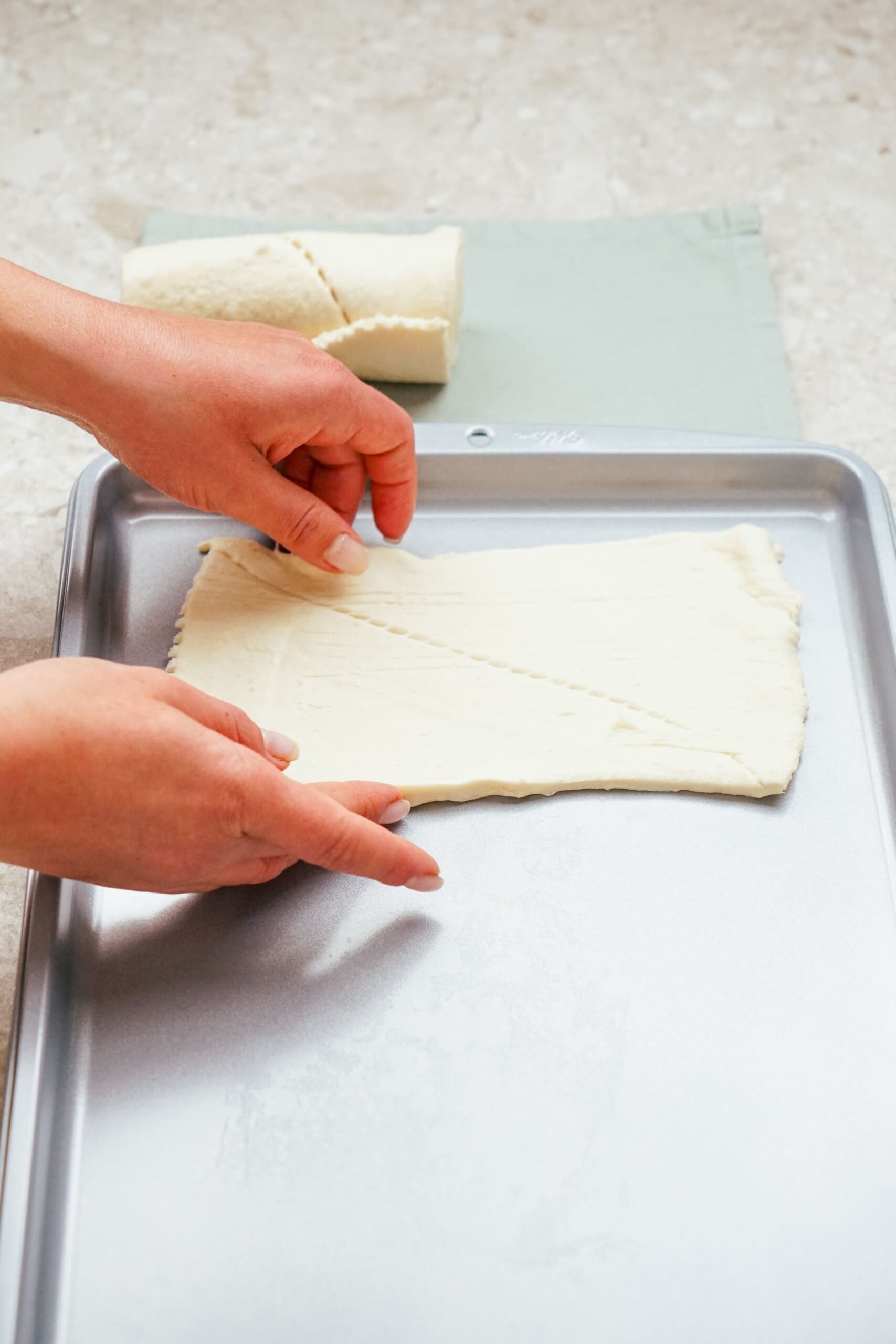 - Pop open crescent roll dough and unroll, leaving crescents in rectangles. On an ungreased baking sheet, lay the crescent roll rectangles together, lining them up width wise. Dough should be almost the entire length of a half sheet pan. Press edges together to even out edges and seal any holes.