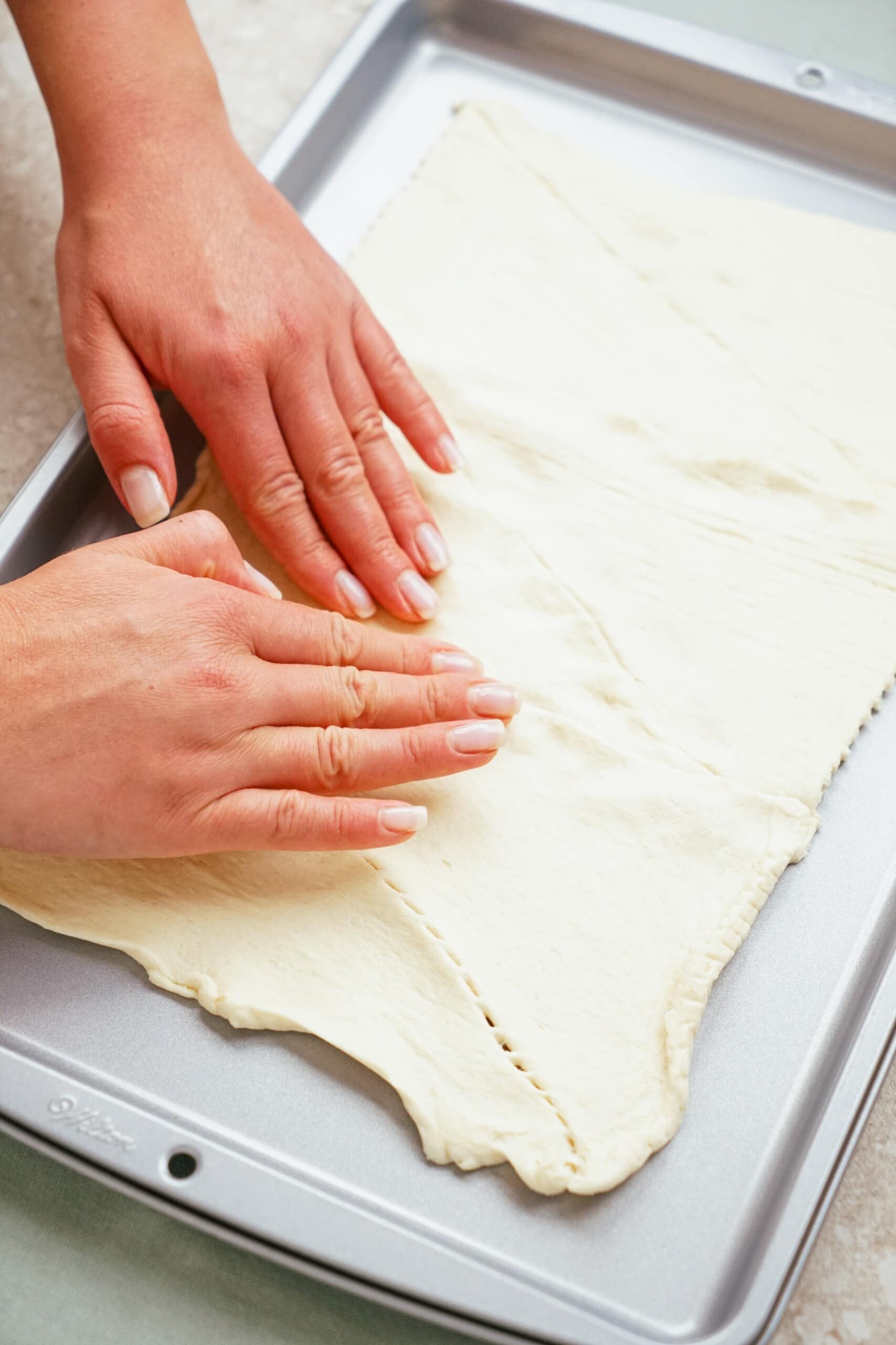 • Pop open crescent roll dough and unroll, leaving crescents in rectangles. On an ungreased baking sheet, lay the crescent roll rectangles together, lining them up width wise. Dough should be almost the entire length of a half sheet pan. Press edges together to even out edges and seal any holes.