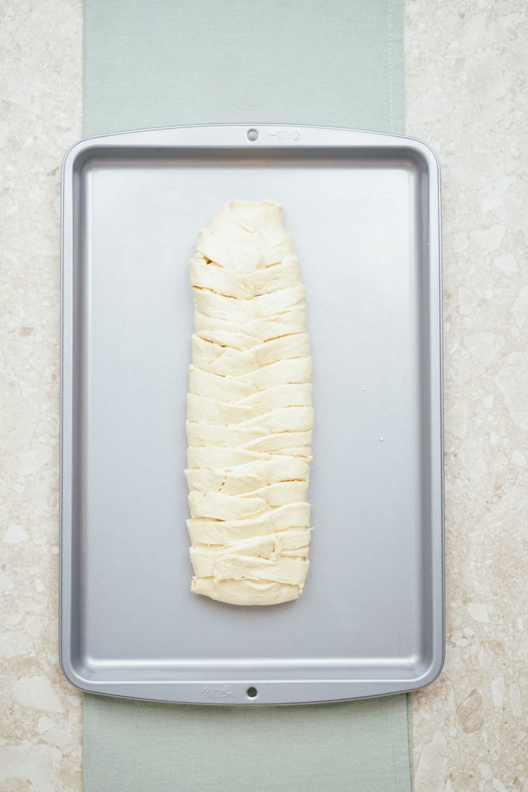 Pop open crescent roll dough and unroll, leaving crescents in rectangles. On an ungreased baking sheet, lay the crescent roll rectangles together, lining them up width wise. The dough should be almost the entire length of a half sheet pan. Press edges together to even out edges and seal any holes.
