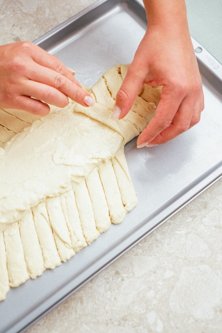 Carefully spread cream cheese filling down the center of the dough to be about 2-3 inches wide.