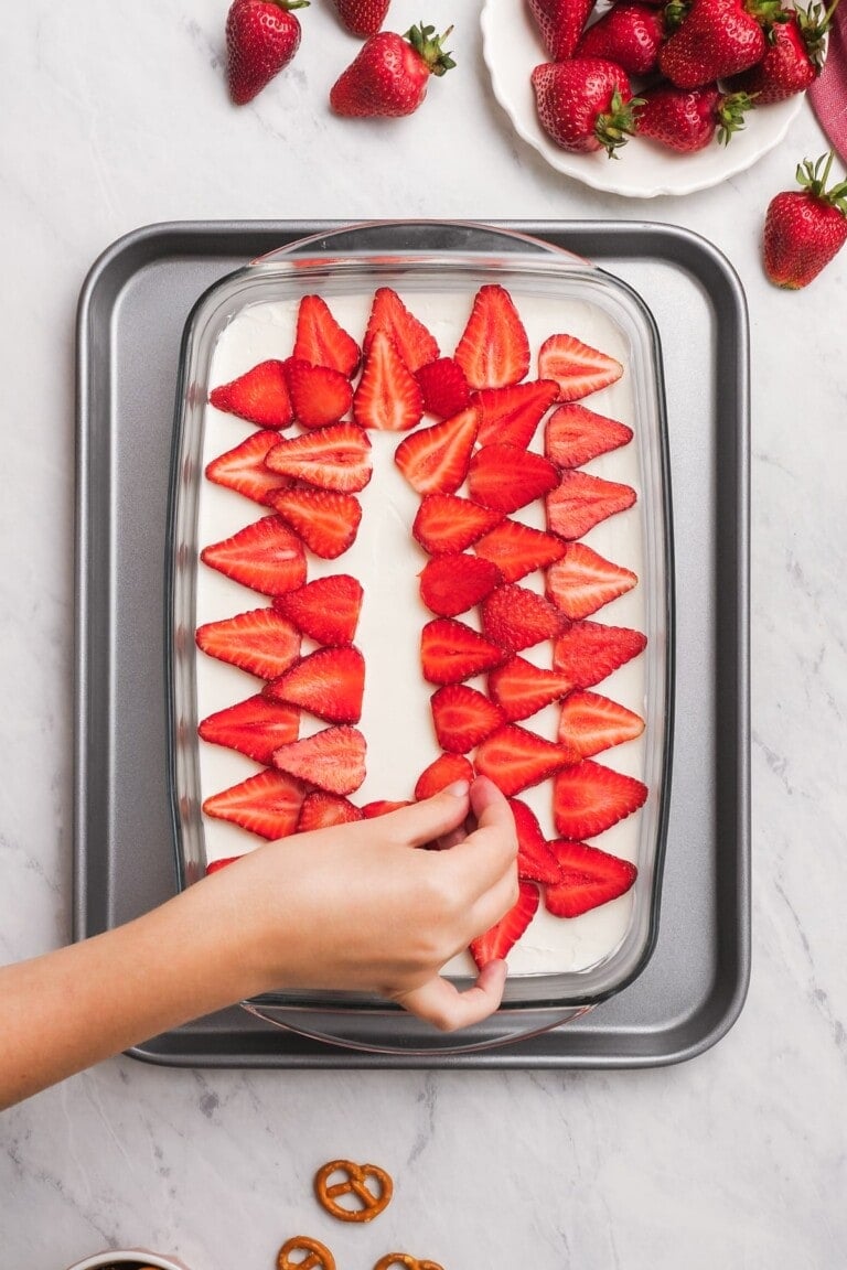 • Evenly disperse sliced strawberries overtop cream cheese layer.