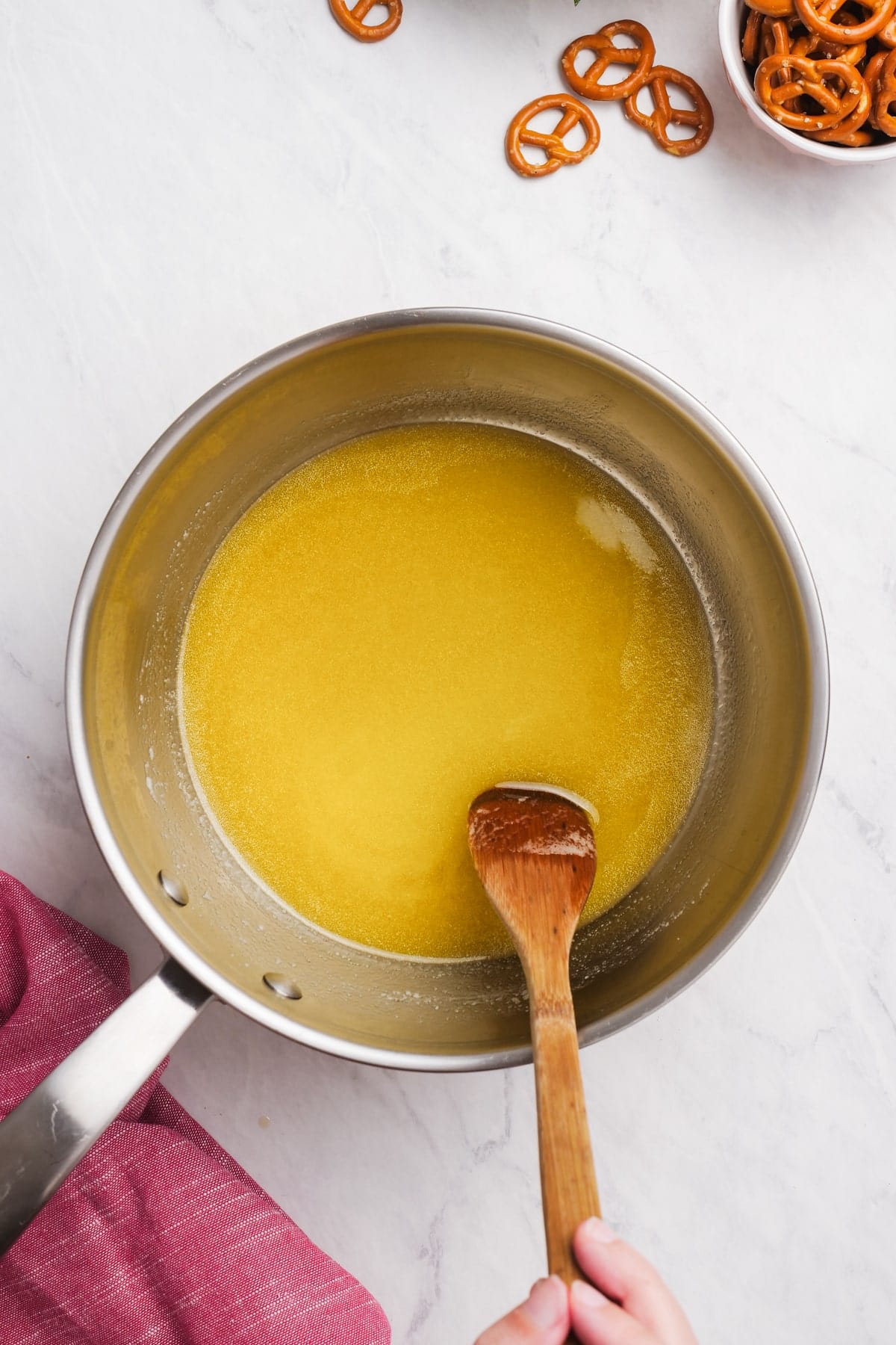 • Add butter and sugar to a small sauce pot and cook on medium heat to melt butter, stirring occasionally to completely dissolve sugar. Remove from heat, then add pretzel crumbs, stirring to combine.