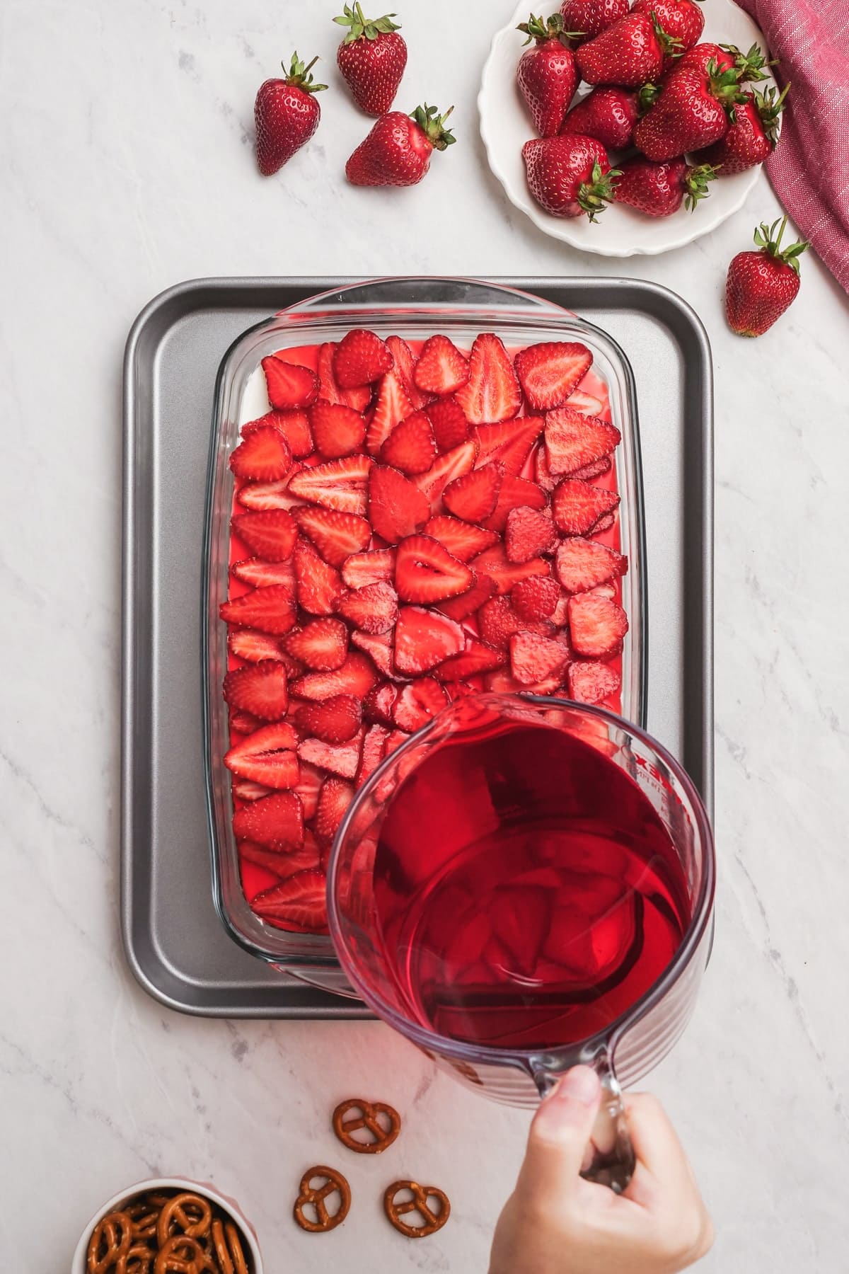 Evenly pour Jell-O overtop strawberries. This should completely fill the dish, but if your dish is not deep enough, you may need to omit some of the Jell-O mixture to avoid overflowing. This will not affect the final outcome.