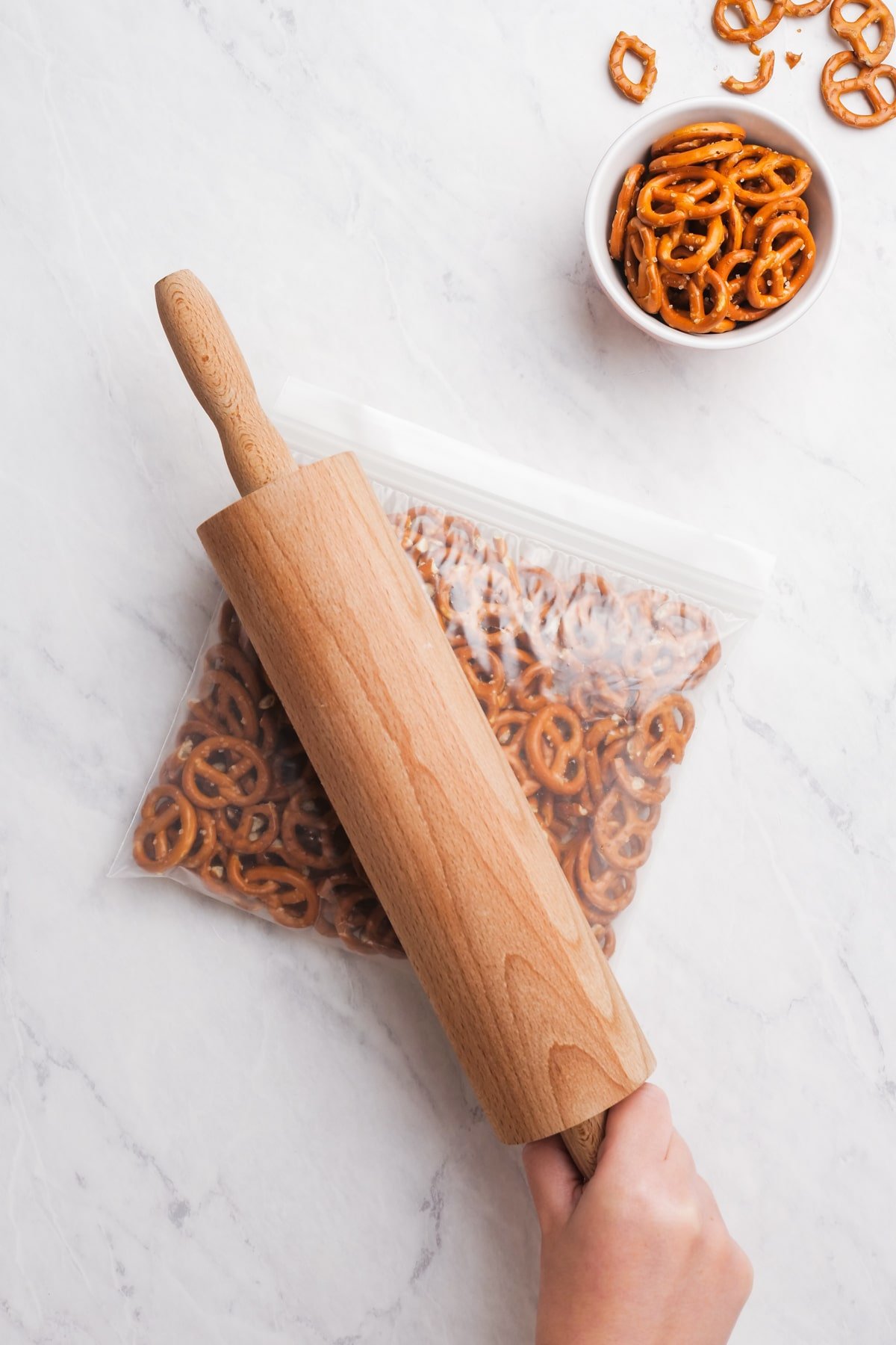• Preheat oven to 350° F. Place pretzels in a zip bag. Using a mallet or rolling pin crush into small crumbles.