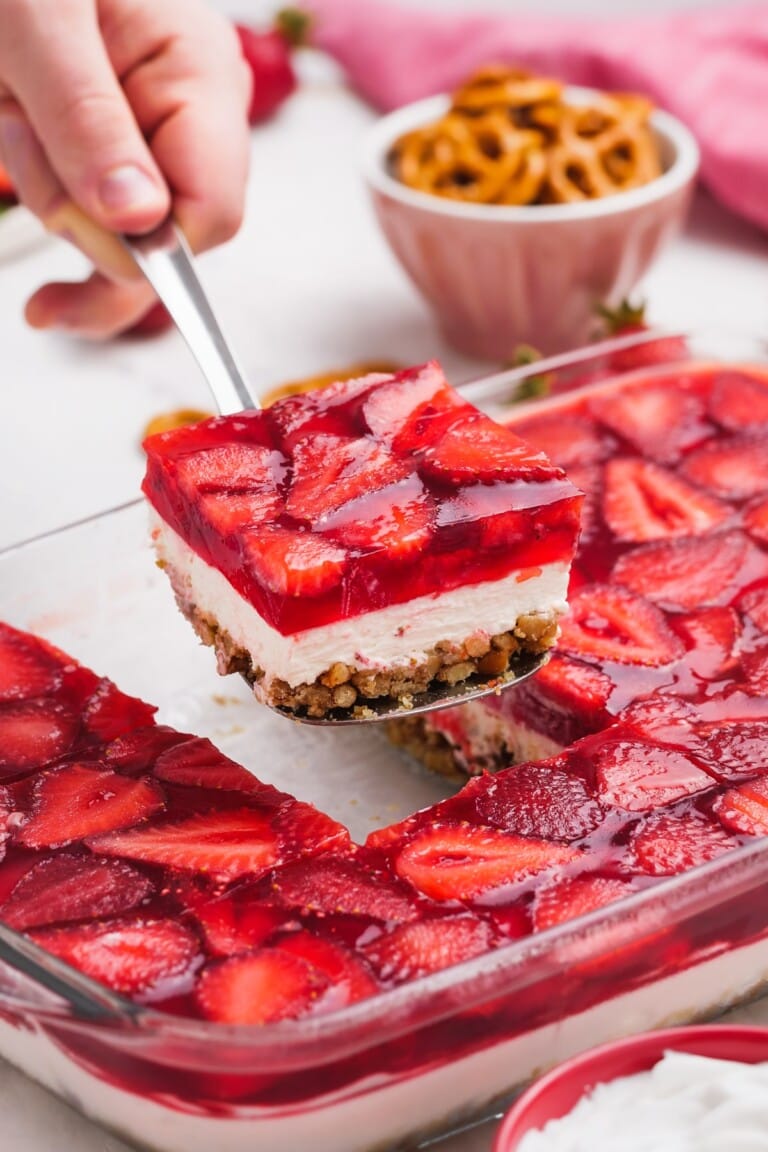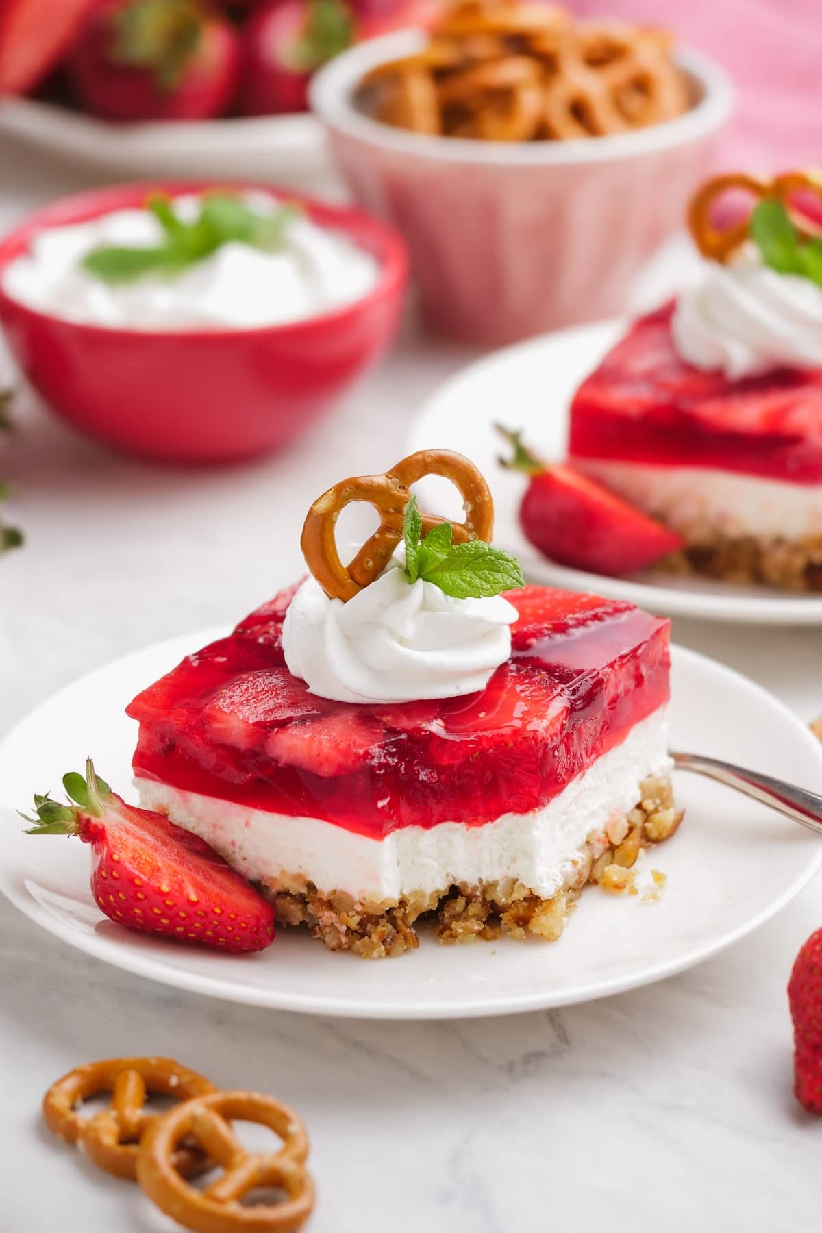 3. Peach pretzel salad: Replace the strawberries with diced fresh peaches and add a sprinkle of cinnamon to the cream cheese layer.