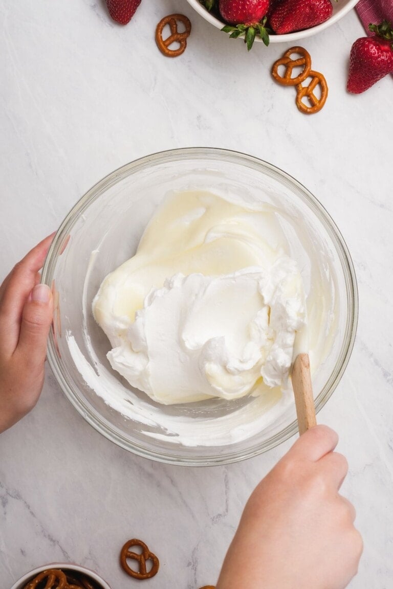 • With a spoon or spatula, fold the Cool Whip into the cream cheese mixture until no white streaks remain.