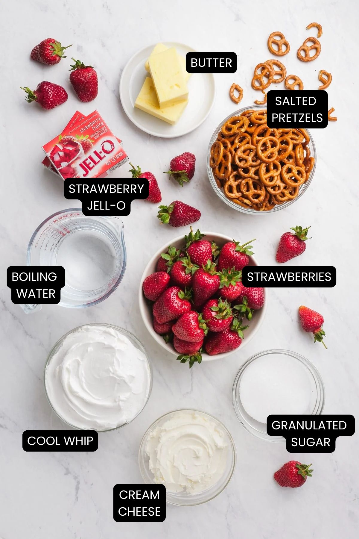 Here are the key ingredients that come together to create this delicious strawberry pretzel dessert: