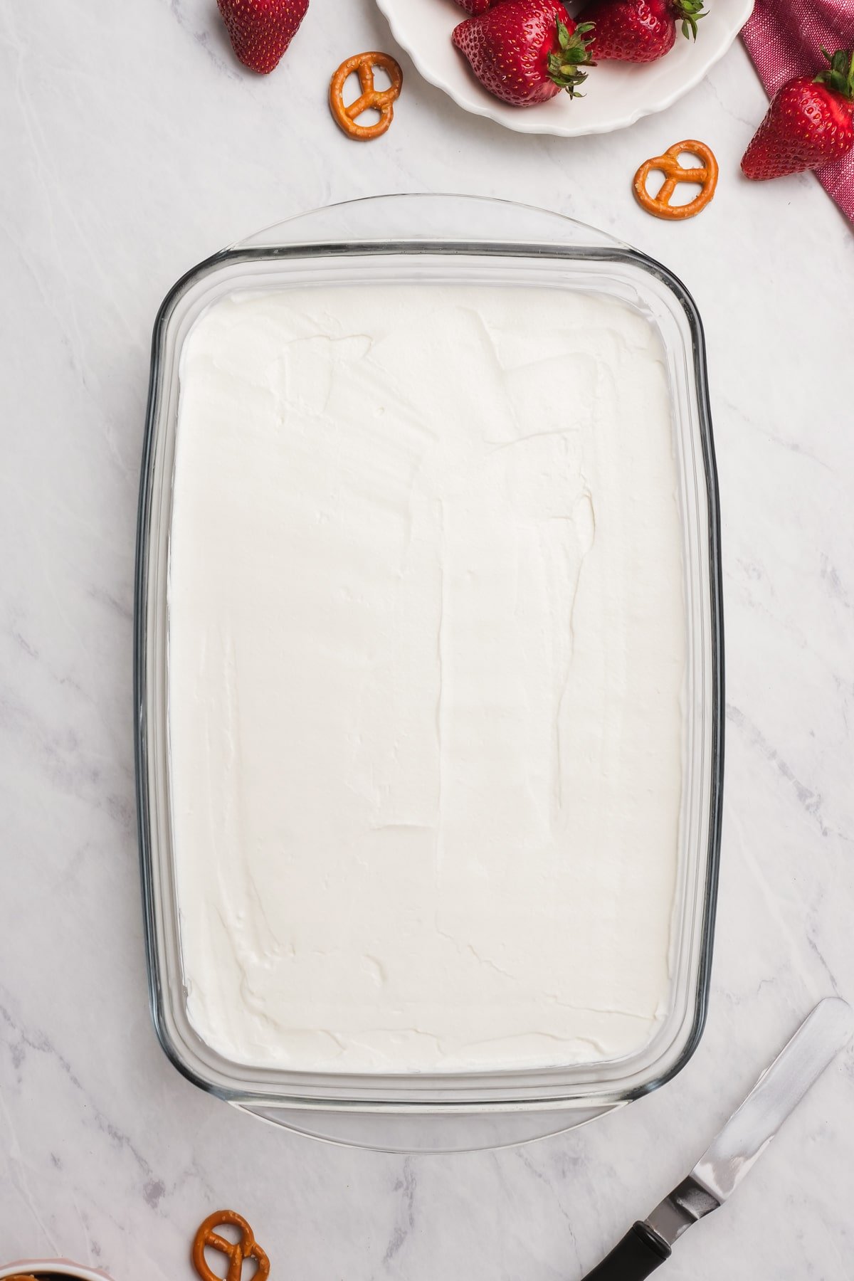 • Evenly spread cream cheese/Cool Whip mixture over cooled pretzels being sure to create a seal all around baking dish so the Jell-O doesn't seep through and you have nice clean layers.
