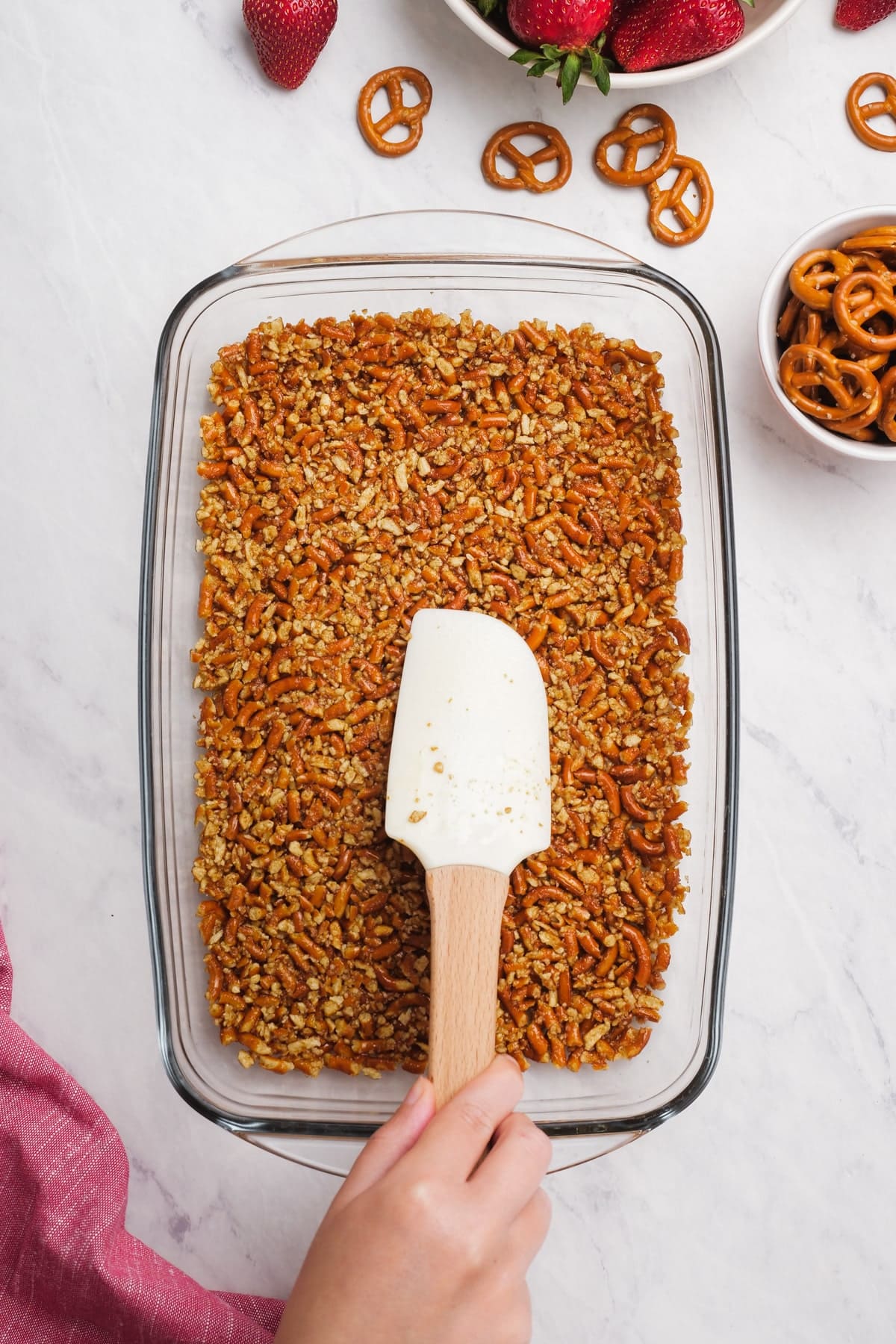 • Pour pretzel mixture into a 9×13 baking dish, pressing down to create an even layer on bottom of dish.
