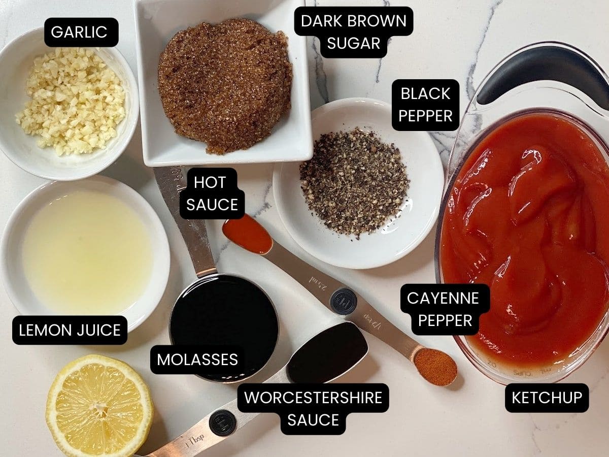 Once the garlic is ready to go, the rest of the sauce comes together in a jiffy! Simply add ketchup, molasses, Worcestershire sauce, hot sauce, black pepper, dark brown sugar, lemon juice and cayenne pepper to the saucepan. Whisk until smooth, then simmer on medium low heat, stirring occasionally for 10-15 minutes or until hot and bubbly. Boom. Done.