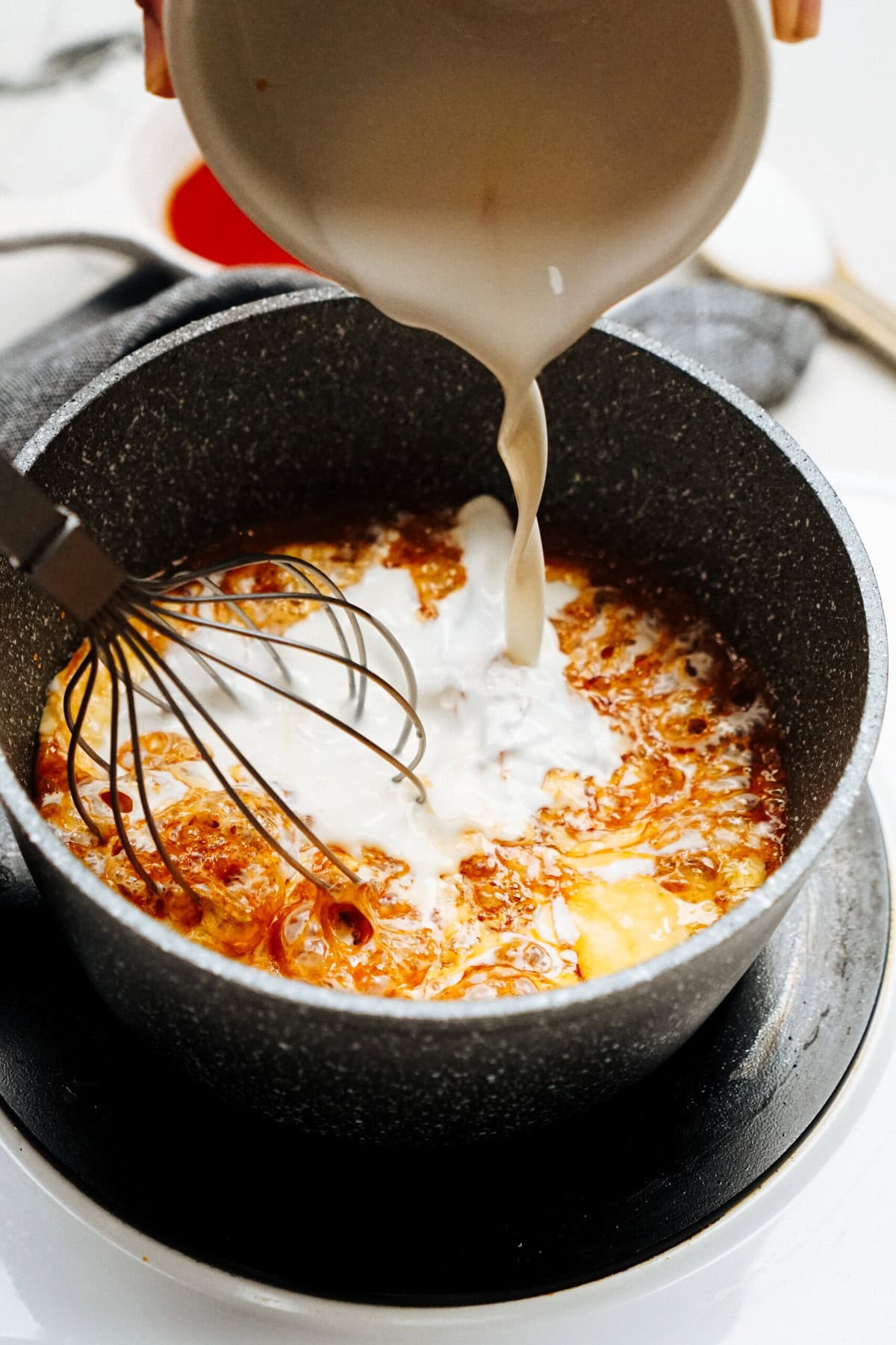 Once the sugar has caramelized to a deep amber color, carefully whisk in room-temperature heavy cream. It will bubble up, so be cautious.
